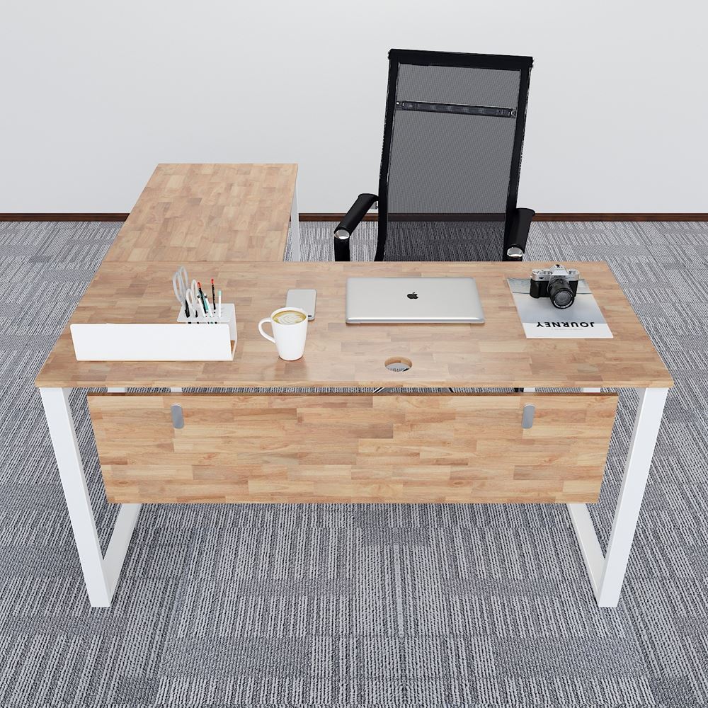 Bàn Chữ L HBMC017 MConcept chân sắt chữ nhật 25x50. Bàn văn phòng gỗ cao su ghép tiêu chuẩn AA dày 17mm PU màu gỗ tự nhiên luôn có một vẻ đẹp riêng, thân thiện với môi trường, đối với các văn phòng mở, văn phòng kết hợp với cây xanh thì việc sử dụng bàn gỗ cao su chân sắt kết hợp trở nên hoàn hảo. Chất liệu gỗ cao su tại HomeOffice là gỗ ghép dày 17mm tiêu chuẩn AA ( 2 mặt đẹp) được xử lý qua 4 công đoạn trước khi PU hoàn thiện cho bề mặt sản phẩm rất đẹp mắt, chống nước tuyệt đối. Khung chân sắt sơn tĩnh điện với cơ cấu ngàm lắp ráp dễ dàng.