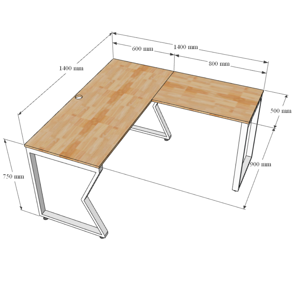 Kích thước chi tiết bàn làm việc góc L 140x140cm ( mặt bàn chính 140x60cm, mặt bàn phụ 80x50cm)