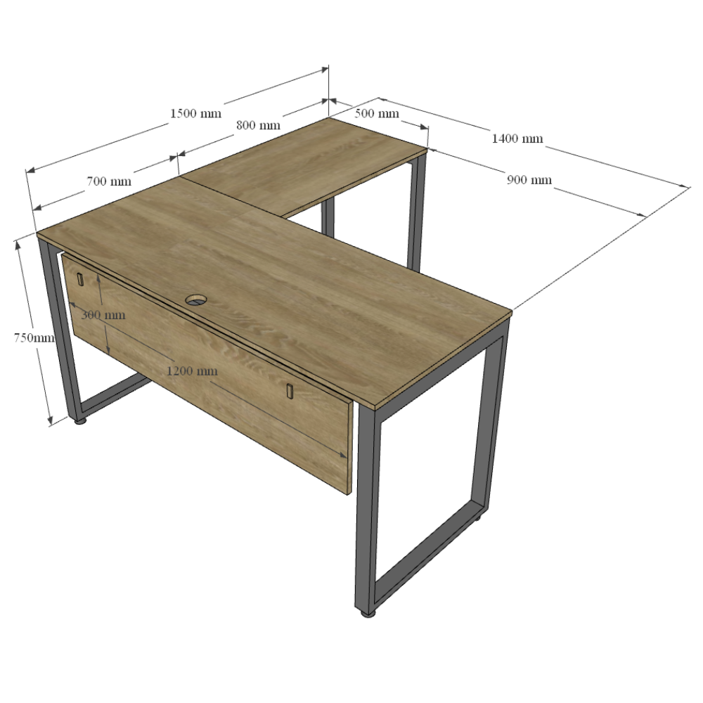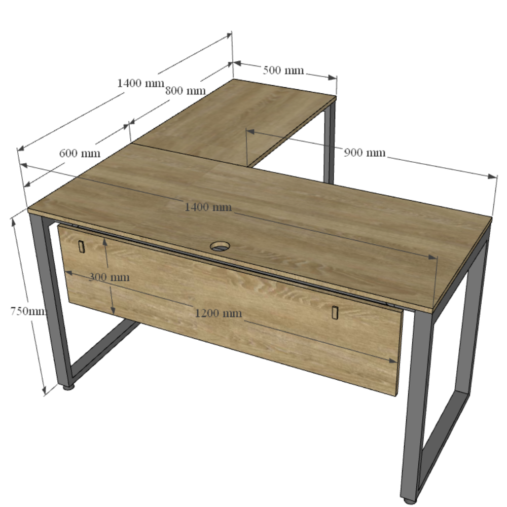 Kích thước chi tiết bàn làm việc góc L 140x150cm ( mặt bàn chính 140x70cm, mặt bàn phụ 80x50cm)