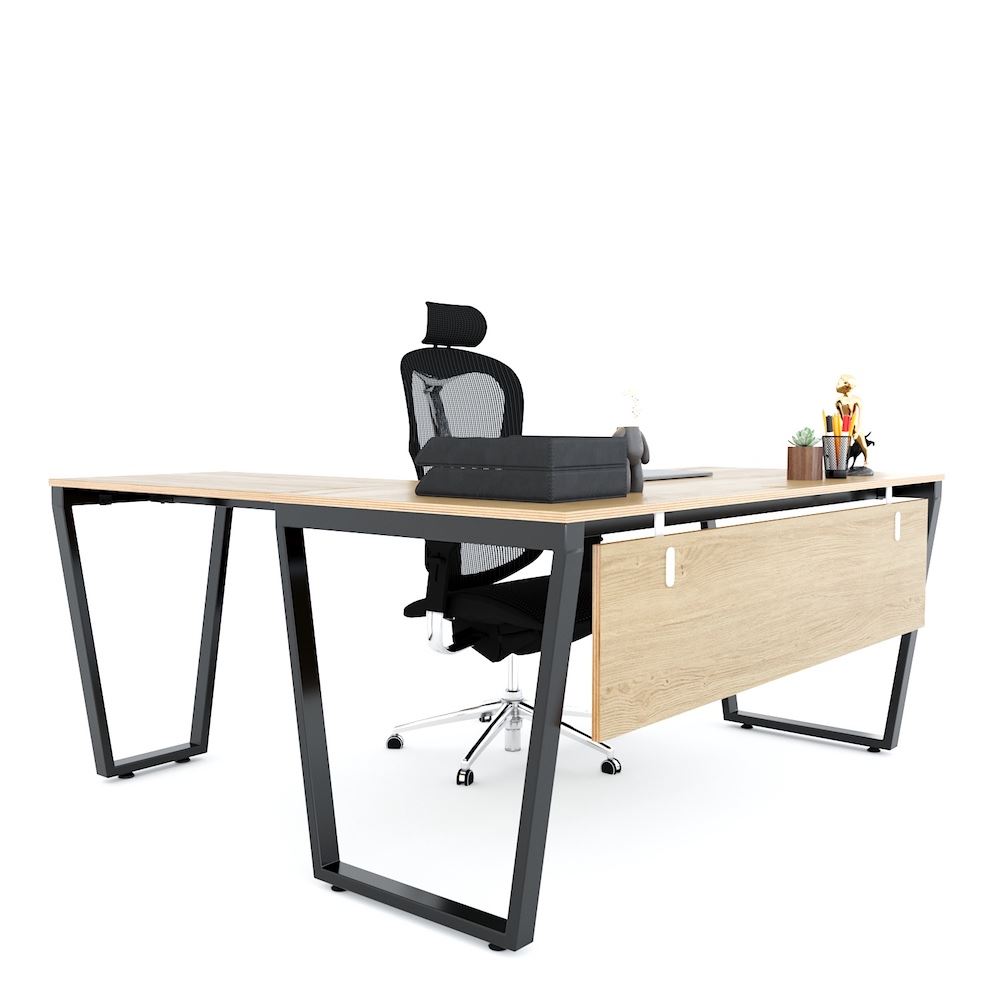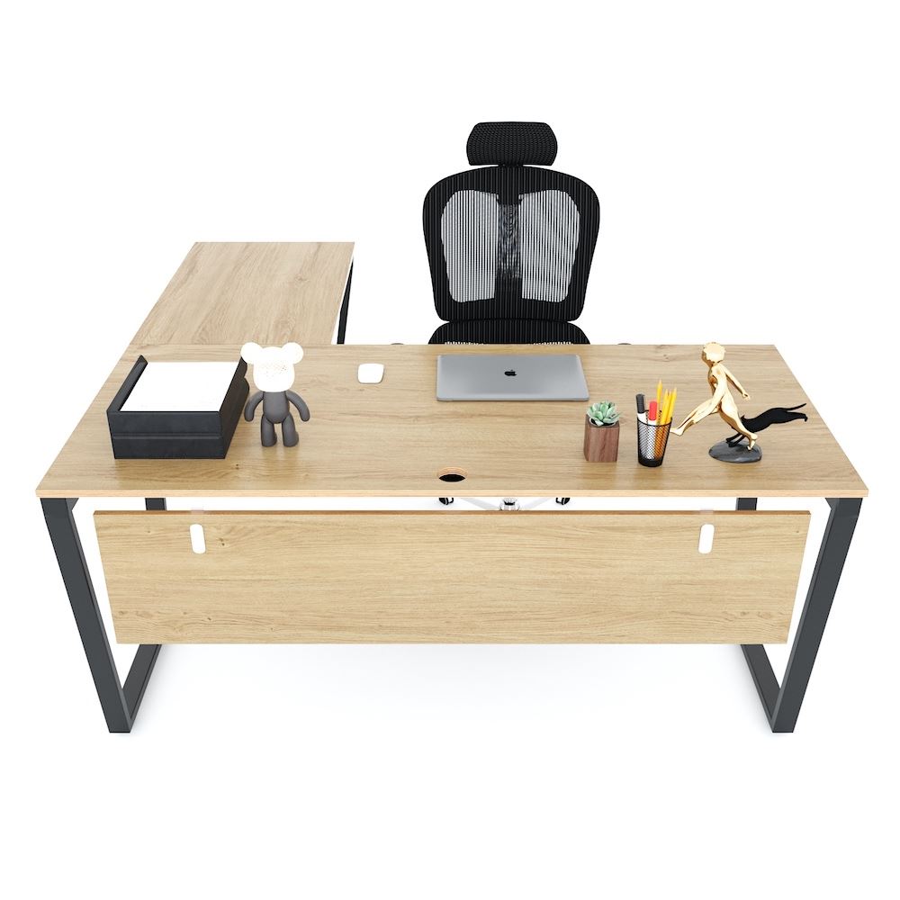 Bàn giám đốc chữ L gỗ Plywood phủ melamin chân sắt Trapeze HBTC039 với mặt bàn gỗ Plywood cốt gỗ tự nhiên bề mặt phủ melamin vân sồi đẹp mắt, bề mặt bàn được xử lý chống thấm nước và cong vênh, màu gỗ tự nhiên đẹp mắt mang đến sự thân thiện, gần gũi cho không gian làm việc của bạn. Kết hợp với mặt bàn Plywood là hệ khung chân sắt theo cơ cấu lắp ráp ngàm thông minh, tiện lợi nhưng vẫn đảm bảo độ chắc chắn, bên cạnh đó bề mặt chân sắt được phủ lớp sơn tĩnh điện cao cấp làm hạn chế ăn mòn hoá học giúp sản phẩm có độ bền cao hơn.