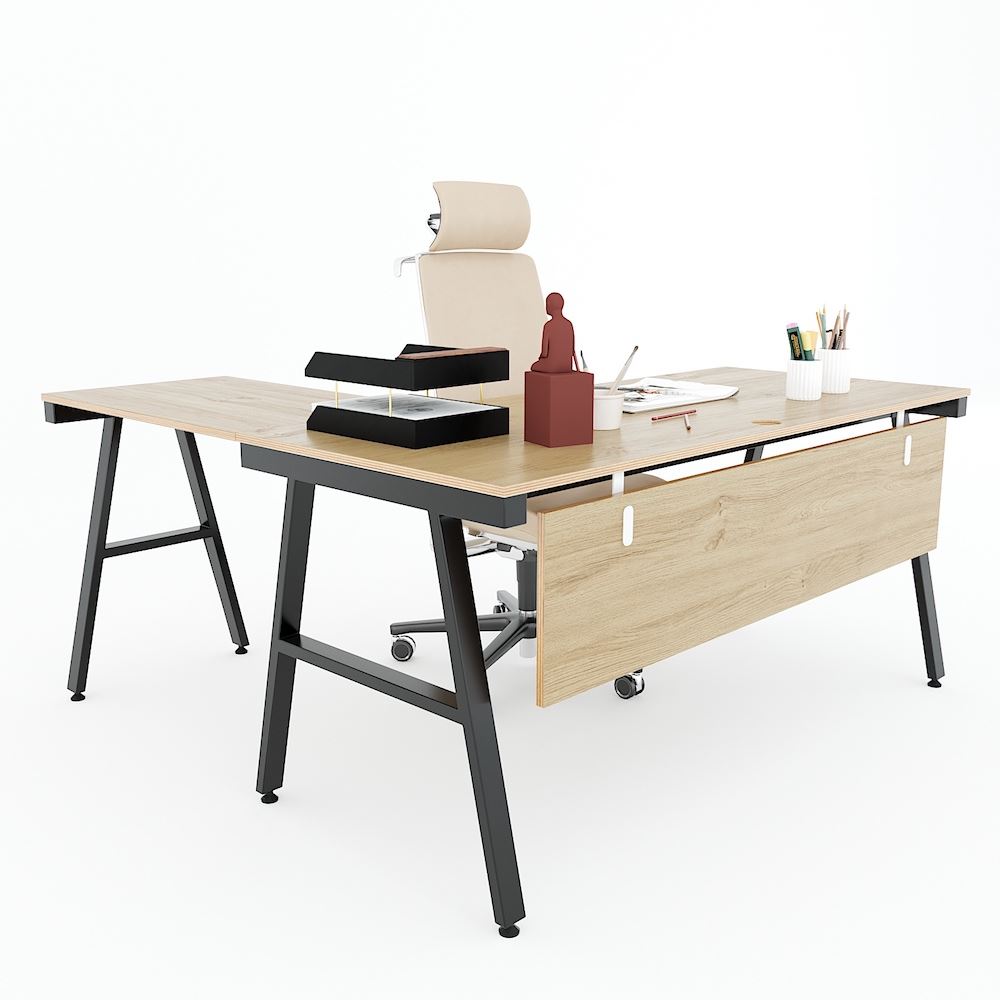 Bàn giám đốc chữ L gỗ Plywood chân sắt Aconcept HBAC044 với mặt bàn gỗ Plywood cốt gỗ tự nhiên bề mặt phủ melamin vân sồi đẹp mắt, bề mặt bàn được xử lý chống thấm nước và cong vênh, màu gỗ tự nhiên đẹp mắt mang đến sự thân thiện, gần gũi cho không gian làm việc của bạn. Kết hợp với mặt gỗ Plywood là hệ khung chân sắt Aconcept cơ cấu lắp ráp ngàm thông minh, tiện lợi nhưng vẫn đảm bảo độ chắc chắn, bề mặt sắt phủ lớp sơn tĩnh điện chất lượng cao bền bỉ theo thời gian.