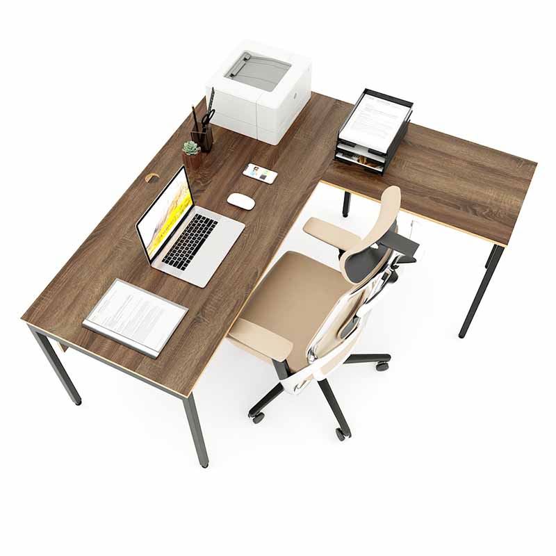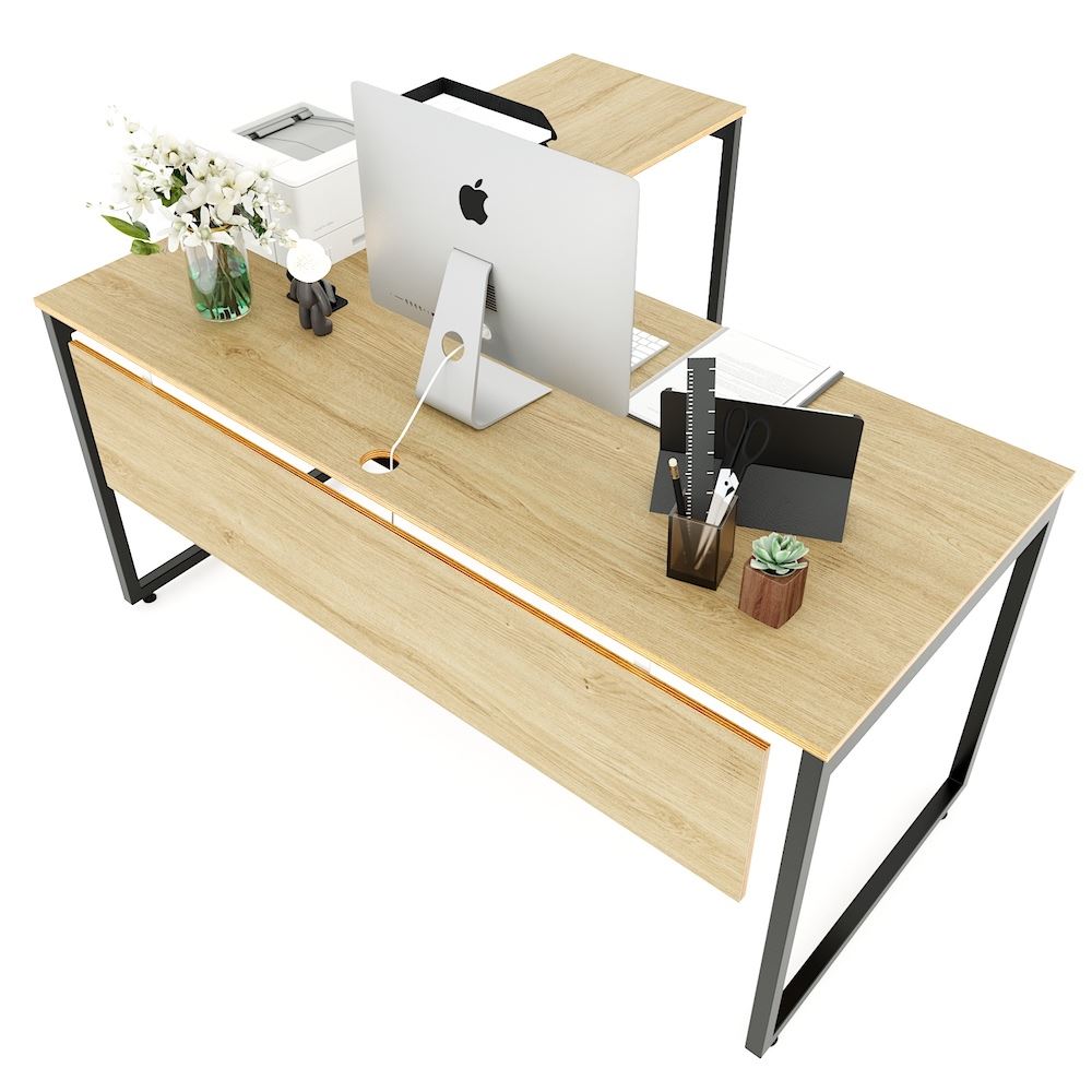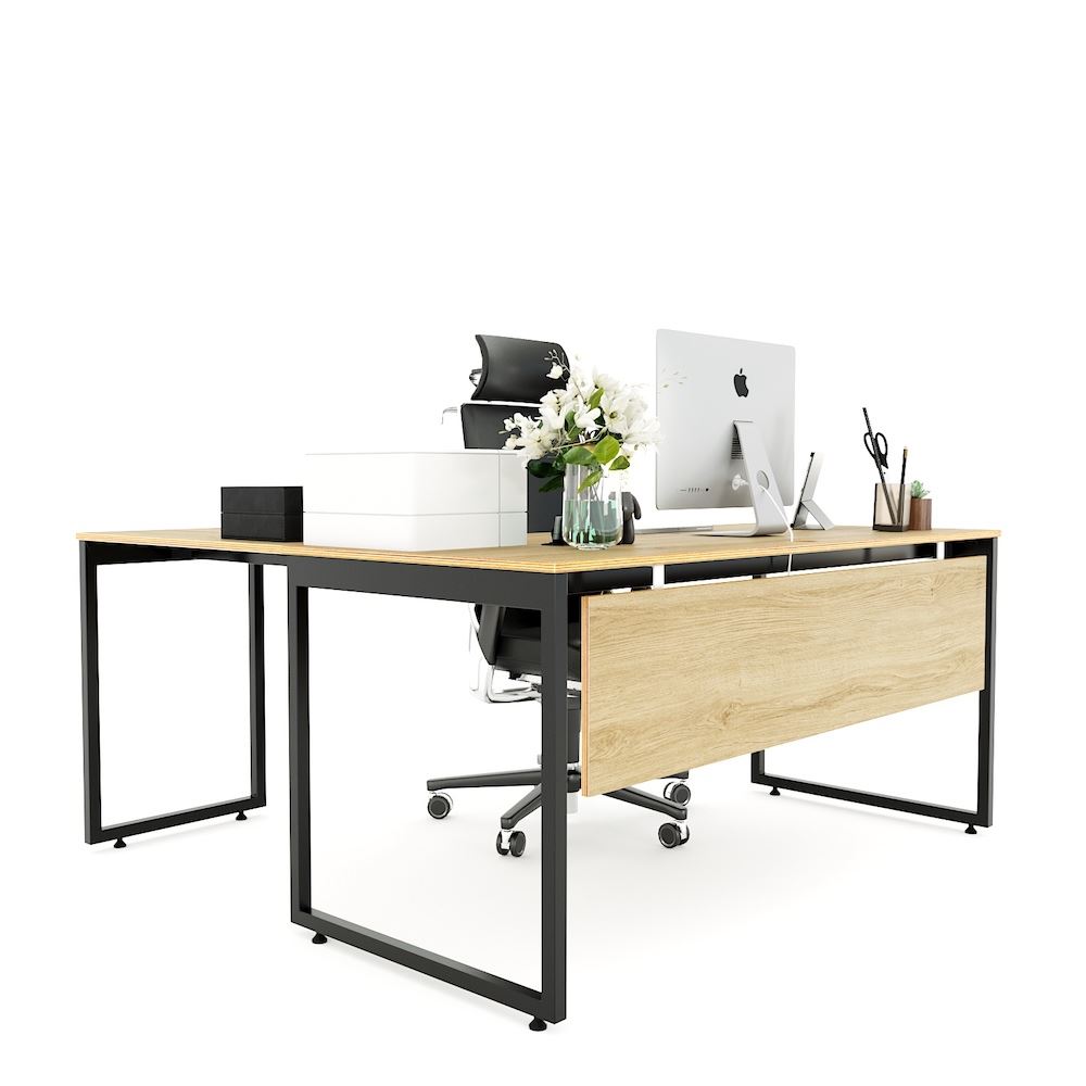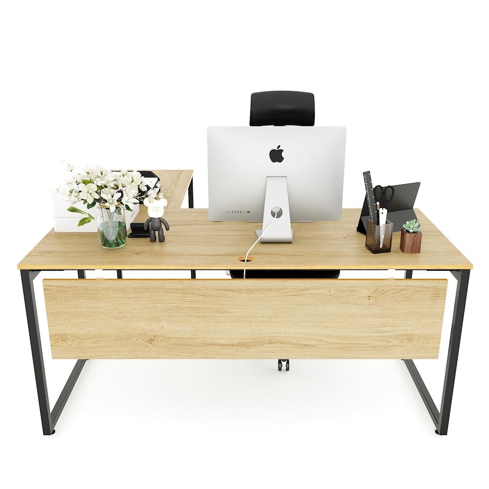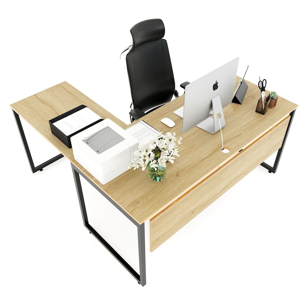 Bàn làm việc chữ L mặt bàn gỗ Plywood phủ melamin vân sồi chân sắt Slean có quỳ