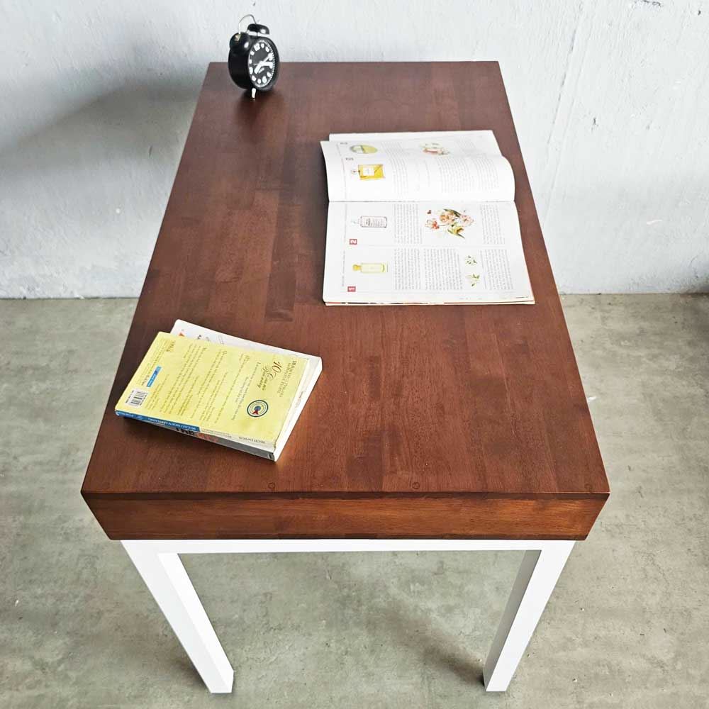 Mặt bàn được làm bằng chất liệu gỗ cao su AA chuẩn xuất khẩu, được tuyển chọn kỹ lưỡng từ những thanh gỗ già, đẹp, không mấu mắt, mang đến vẻ đẹp tự nhiên, sang trọng cho sản phẩm. Bề mặt gỗ được xử lý kỹ lưỡng, chống thấm, đảm bảo độ bền và dễ dàng vệ sinh. Thiết kế chân bàn vuông vắn, khỏe khoắn, kết hợp với mặt bàn gỗ tạo nên sự cân đối, hài hòa.