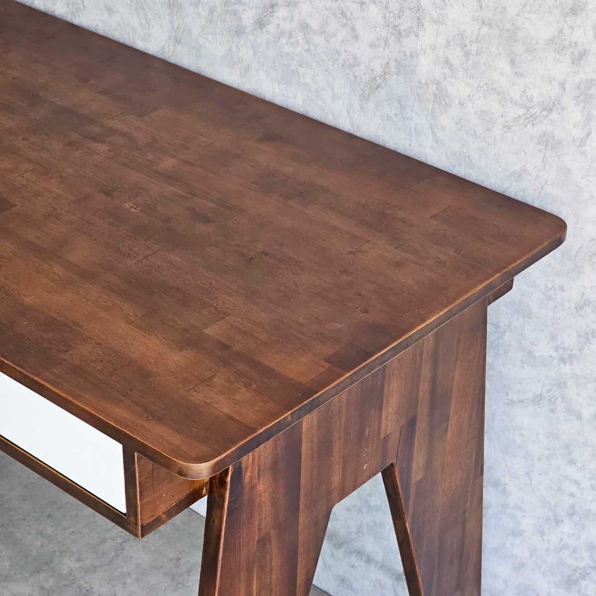 Bàn làm việc được làm hoàn toàn từ gỗ cao su và gỗ tràm AA, tiêu chuẩn gỗ cao nhất với vân gỗ đẹp mắt và cứng cáp. Gỗ cao su được xử lý bề mặt mịn màng giúp bạn cảm thấy dễ chịu khi sử dụng. Khung chân được làm bằng gỗ tràm, một loại gỗ tự nhiên chống cong vênh tốt, đảm bảo độ bền bỉ cho sản phẩm theo thời gian. Mặt bàn đã được xử lý mịn màng, phủ sơn bóng đẹp mắt, dễ dàng lau chùi, giữ cho vẻ đẹp tự nhiên của gỗ luôn được giữ gìn.