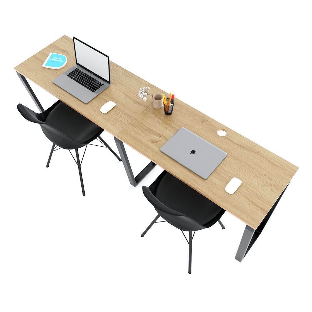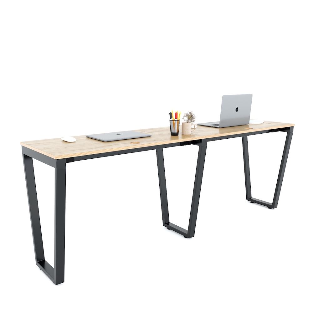 Bàn làm việc cụm 2 200x50cm chân sắt hệ Trapeze HBTC034 với mặt bàn gỗ Plywood cốt gỗ tự nhiên bề mặt phủ melamin vân sồi đẹp mắt, bề mặt bàn được xử lý chống thấm nước và cong vênh, màu gỗ tự nhiên đẹp mắt mang đến sự thân thiện, gần gũi cho không gian làm việc của bạn. Kết hợp với mặt bàn Plywood là hệ khung chân sắt theo cơ cấu lắp ráp ngàm thông minh, tiện lợi nhưng vẫn đảm bảo độ chắc chắn, bên cạnh đó bề mặt chân sắt được phủ lớp sơn tĩnh điện cao cấp làm hạn chế ăn mòn hoá học giúp sản phẩm có độ bền cao hơn.