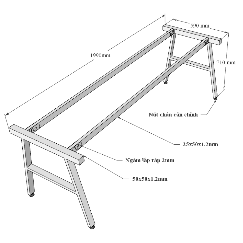 - Chất liệu: Gỗ cao su dày 17mm, khung chân sắt 25x50mm và 50x50mm dày 1.2mm cơ cấu lắp ráp