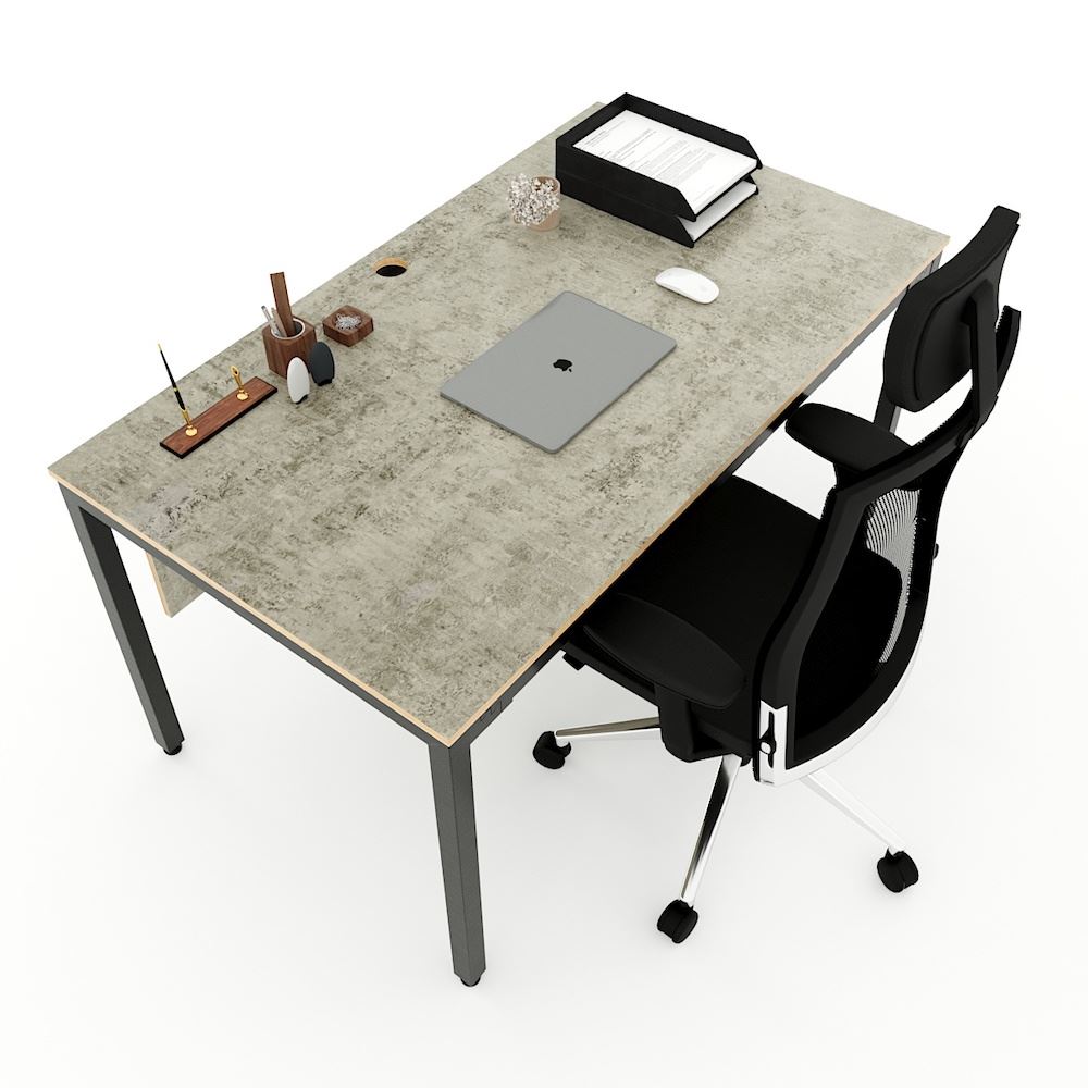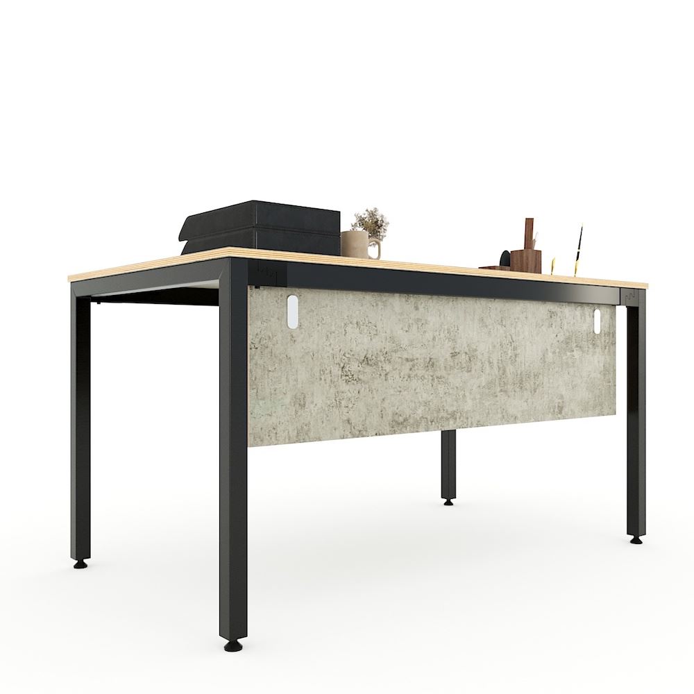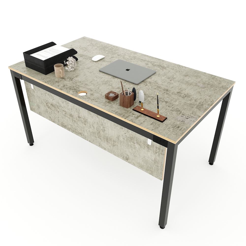 Bàn làm việc 140x80cm chân sắt hệ Uconcept HBUC043 với mặt bàn gỗ Plywood cốt gỗ tự nhiên bề mặt phủ melamin được xử lý chống thấm nước và cong vênh, mặt bàn màu bê tông độc đáo chắc chắn là điểm nhấn thú vị cho không gian làm việc. Kết hợp với mặt bàn Plywood là hệ khung chân sắt theo cơ cấu lắp ráp ngàm thông minh, tiện lợi nhưng vẫn đảm bảo độ chắc chắn, bên cạnh đó bề mặt chân sắt được phủ lớp sơn tĩnh điện cao cấp làm hạn chế ăn mòn hoá học giúp sản phẩm có độ bền cao hơn. Bàn với kích thước 140x80cm khá rộng rãi dành cho các vị lãnh đạo hay làm việc tại nhà, bàn có tấm che chân treo với phụ kiện treo cao cấp rất đẹp mắt.