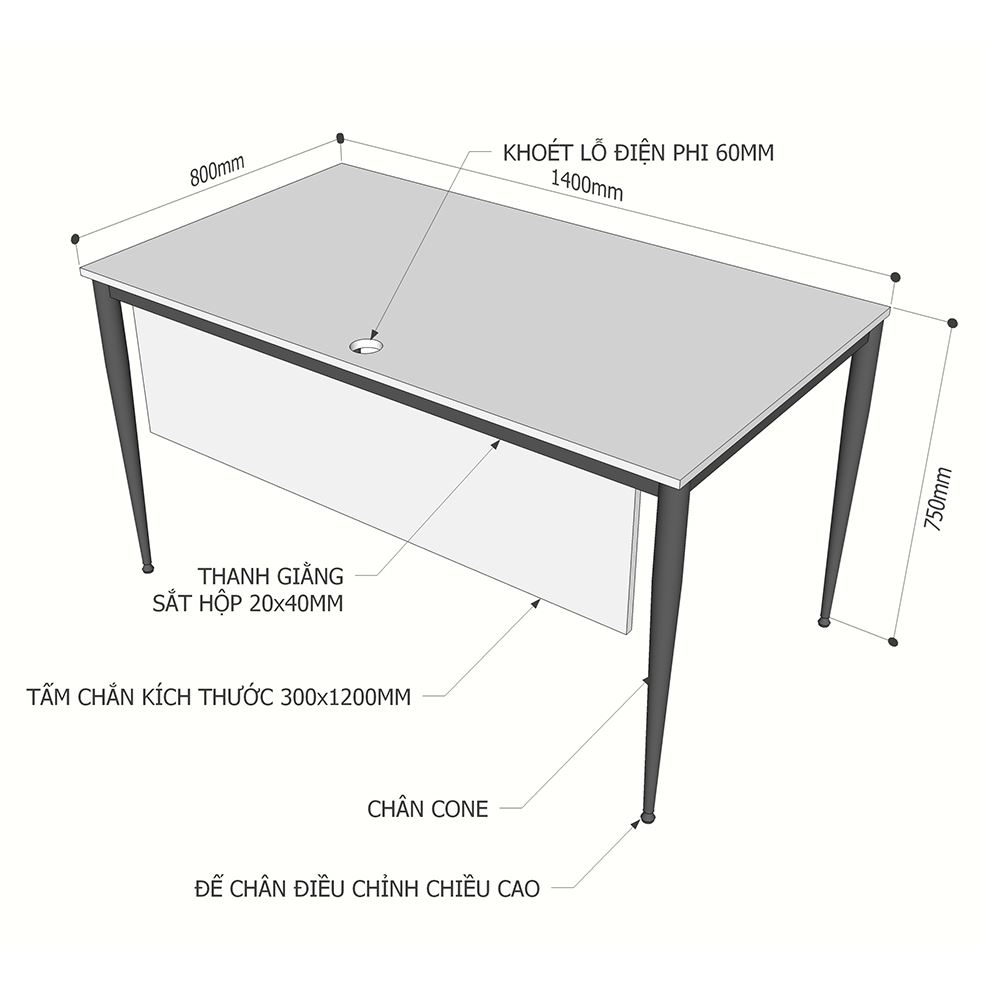 Bàn làm việc 140x80cm gỗ Plywood phủ melamin chân hệ Cone II