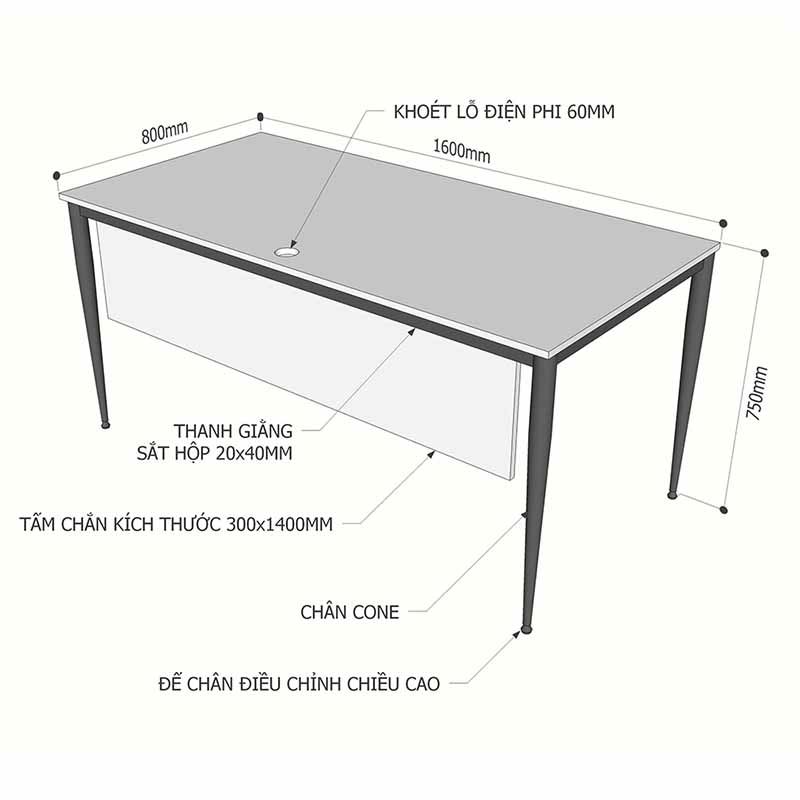 Bàn làm việc 160x80cm gỗ Plywood phủ melamin chân hệ Cone II