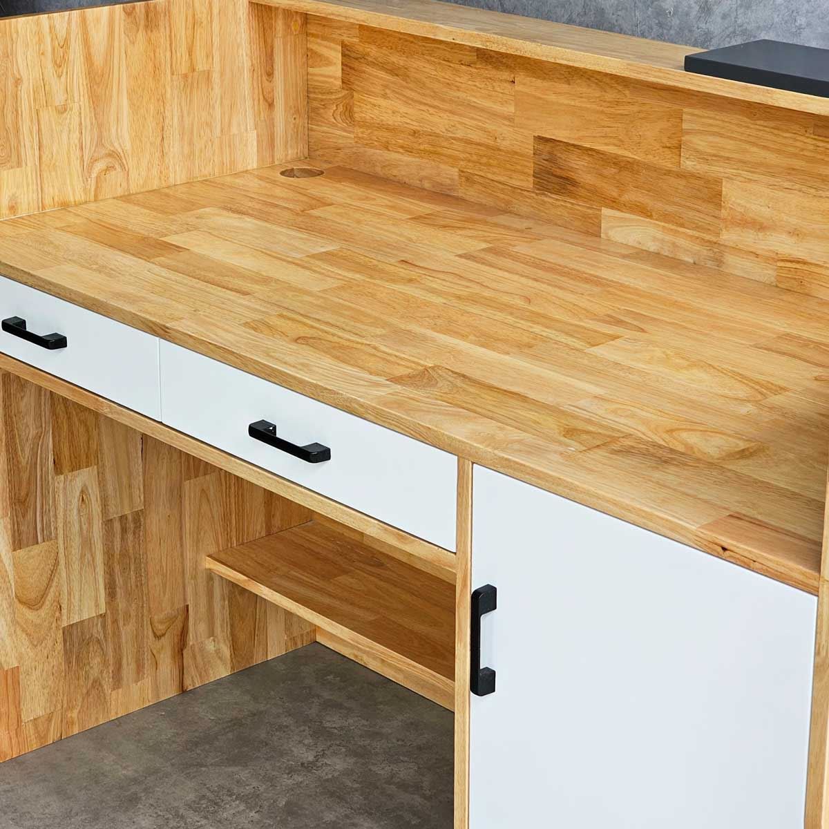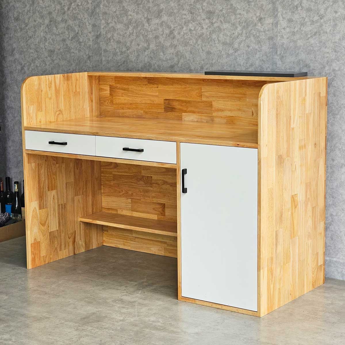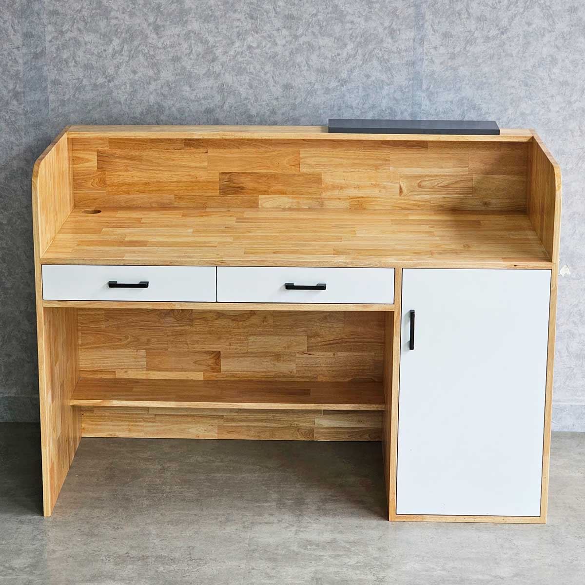 Bàn lễ tân 1m4 có hộc kéo gỗ cao su tự nhiên BLT68016 được làm hoàn toàn từ gỗ cao su AA tiêu chuẩn xuất khẩu đã qua xử lý chống cong vênh, đảm bảo độ bền cao. Mặt gỗ có phủ 2 lớp PU chống ẩm chống thấm nước giúp tăng độ bền của sản phẩm và giúp dễ dàng lau chùi. Đằng sau mặt với thiết kế 2 ngăn kéo và 1 hộc tủ giúp bảo quản đồ đạc an toàn hơn.