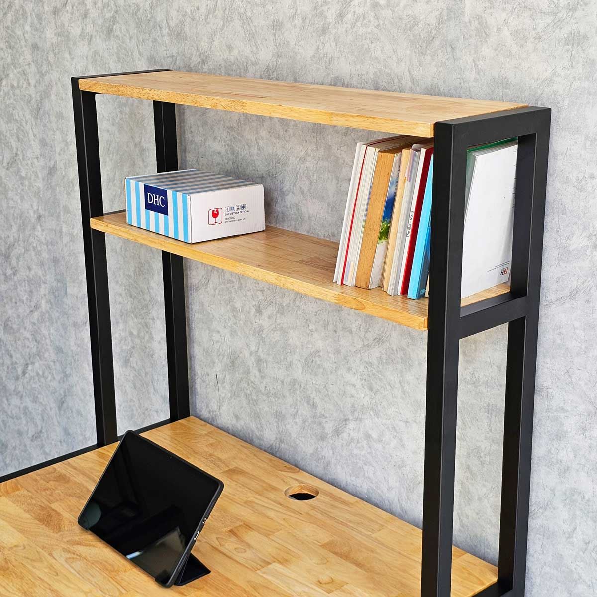 Kệ sách liền với khung bàn giúp bạn để được một hàng sách vở và đồ trang trí