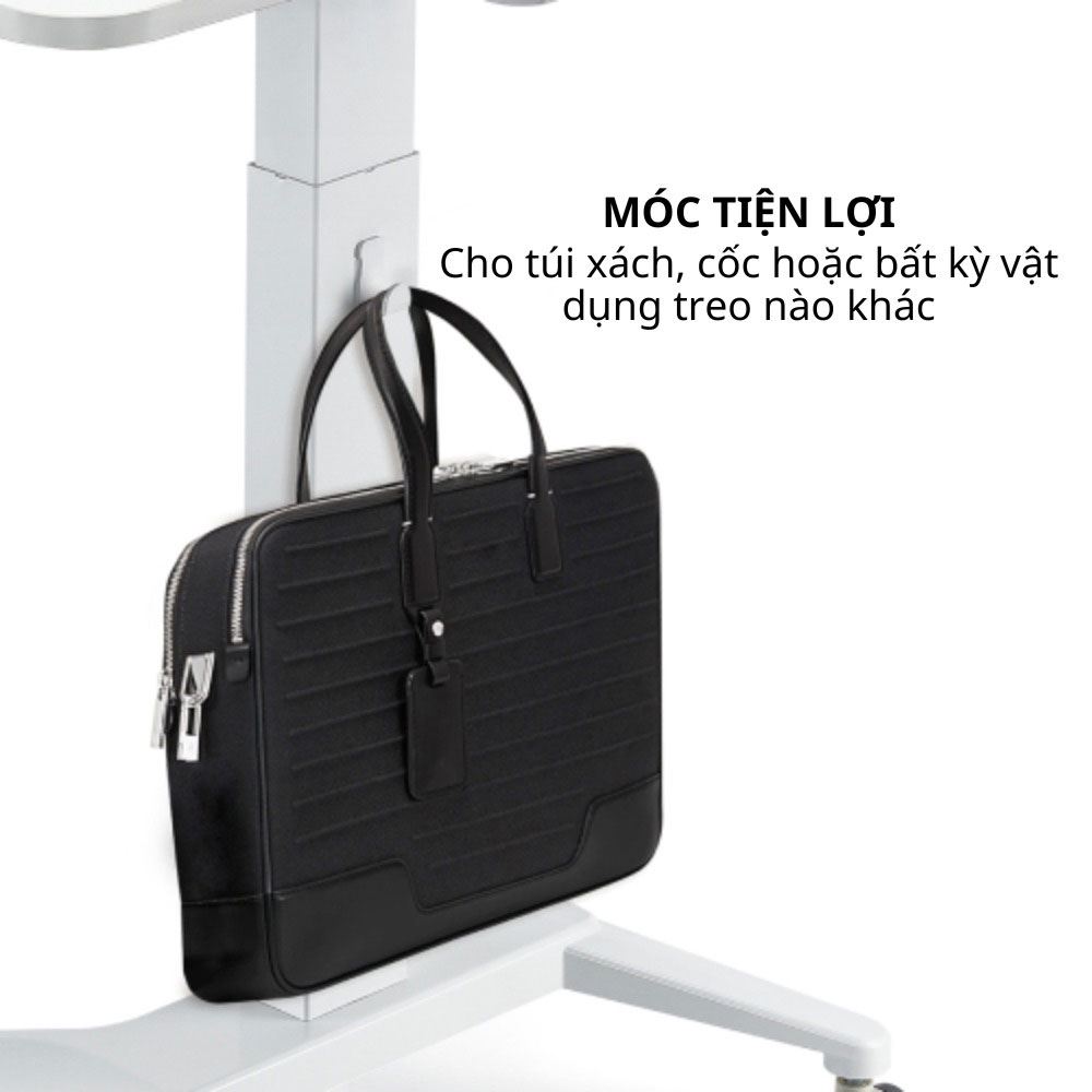 Bàn được trang bị móc treo đa năng giúp bạn dễ dàng treo túi xách, tai nghe hoặc các vật dụng khác. Bánh xe chịu lực giúp di chuyển bàn dễ dàng mà không gây tiếng ồn. Chân đế được thiết kế rộng rãi, đảm bảo độ ổn định cho bàn khi nâng hạ ở mọi độ cao.