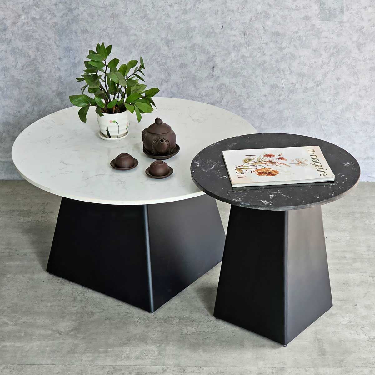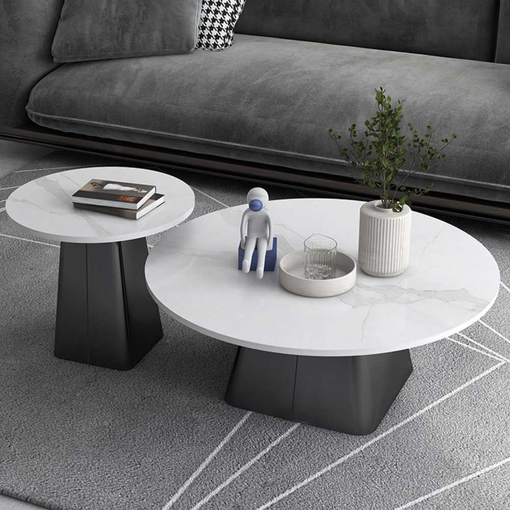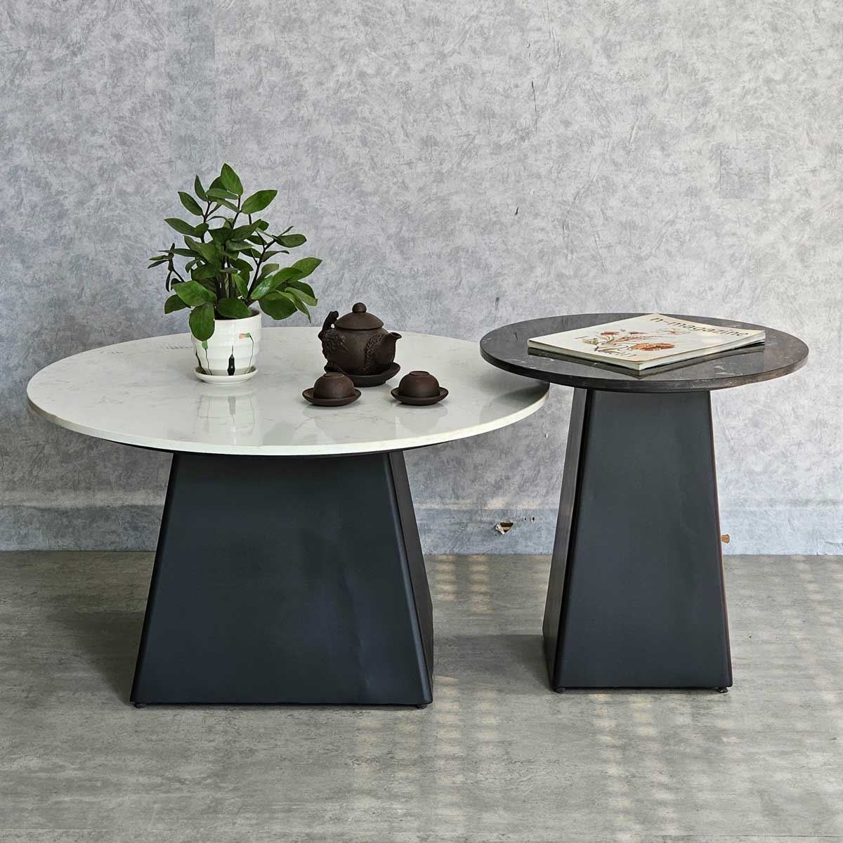 Bàn sofa đôi mặt đá ceramic chân sắt TT68241 gồm 2 bàn sofa lớn đường kính 70cm và bàn nhỏ đường kính 50cm. Mặt bàn đá Ceramic sử dụng công nghệ cao nên có những ưu điểm vượt trội như độ bền cao, khả năng chịu nhiệt tốt cũng hạn như trầy xước trong quá trình sử dụng. Kết hợp mặt bàn đá ceramic là chân sắt được gia công cẩn thận, tỉ mỉ có độ hoàn thiện cao sắt sơn tĩnh điện chất lượng cao màu sắc đẹp mắt và bền bỉ theo thời gian. Bộ bàn sofa TT68241 toát lên vẻ đẹp sang trọng giúp nâng tầm giá trị cho không gian sử dụng nên được nhiều khách hàng yêu thích