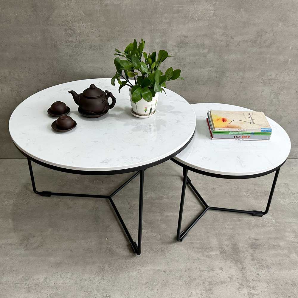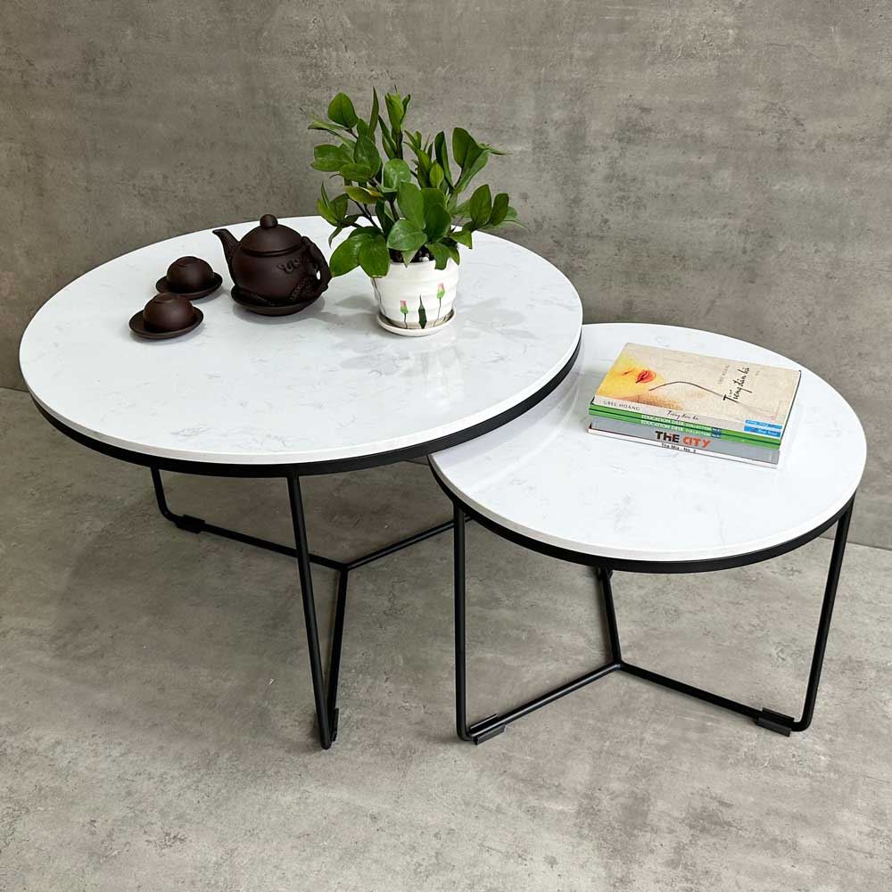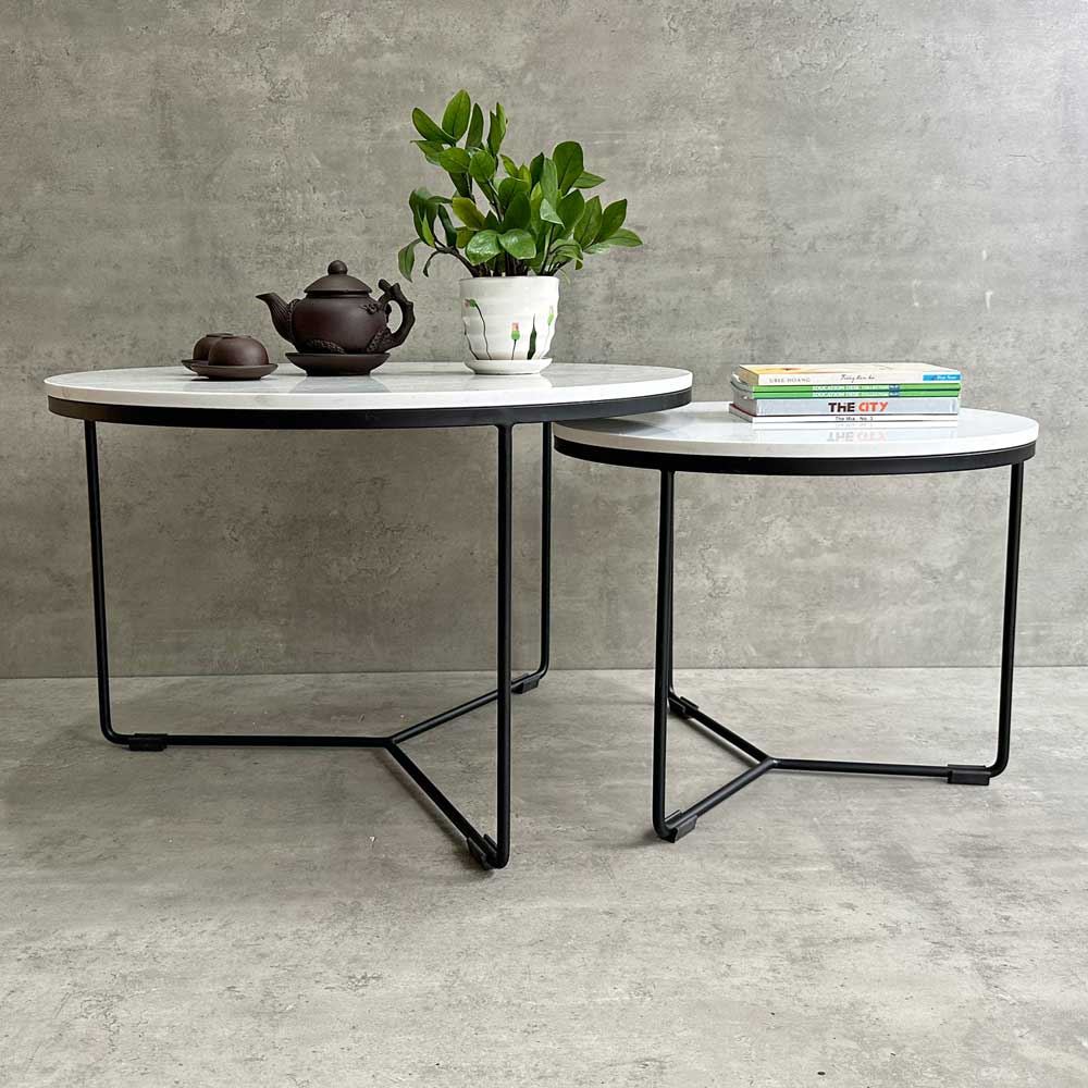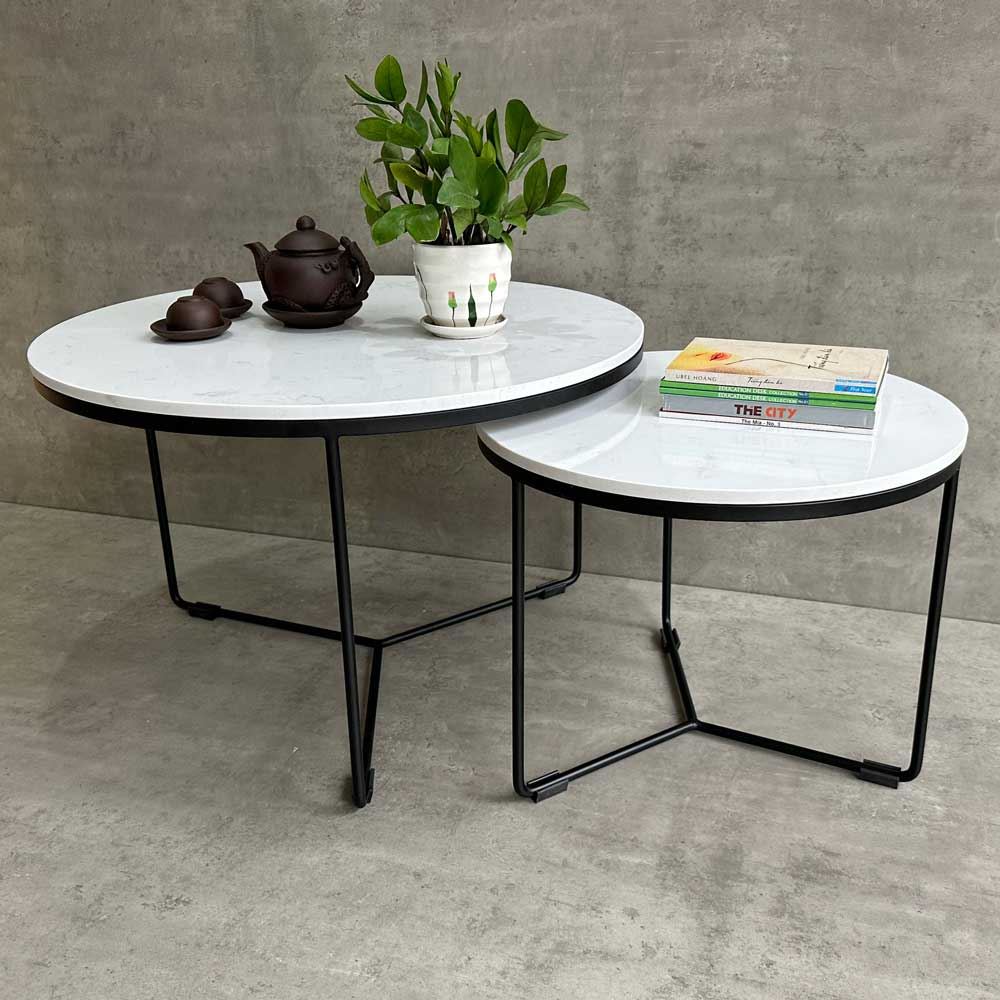 Bàn Sofa đôi mặt đá chân sắt TT68206 bộ bàn tròn chân sắt thiết kế hiện đại với mặt bàn được làm bằng đá nhân tạo dày 15mm với màu đá Trắng vân mây hoạc Đen vân mây rất sang trọng, kết hợp với khung chân sắt sơn tĩnh điện nhiều màu lựa chọn. Mặt bàn lớn kích tước tròn 70cm cao 45cm kết hợp với bàn nhỏ kích thước tròn 50cm và cao 40cm. Quý khách có thể tuỳ chọn các màu mặt bàn riêng đế phối cho phù hợp.