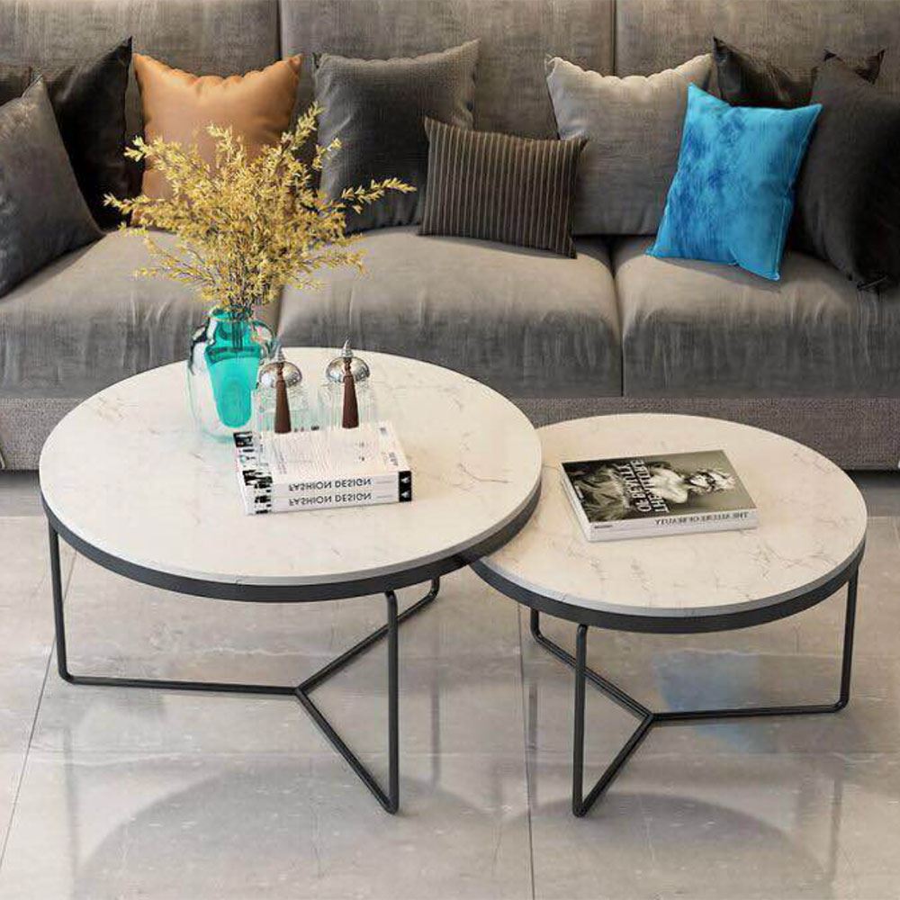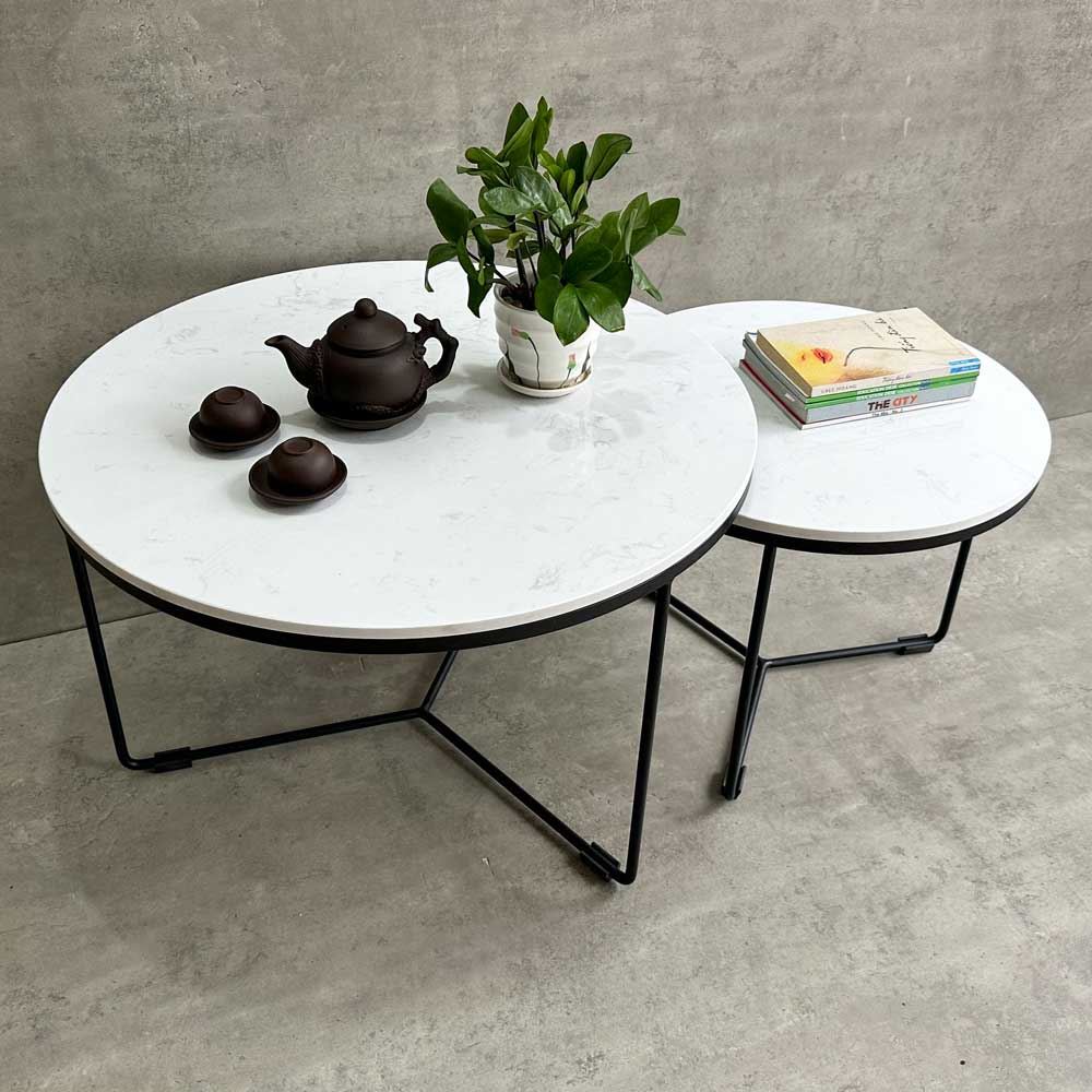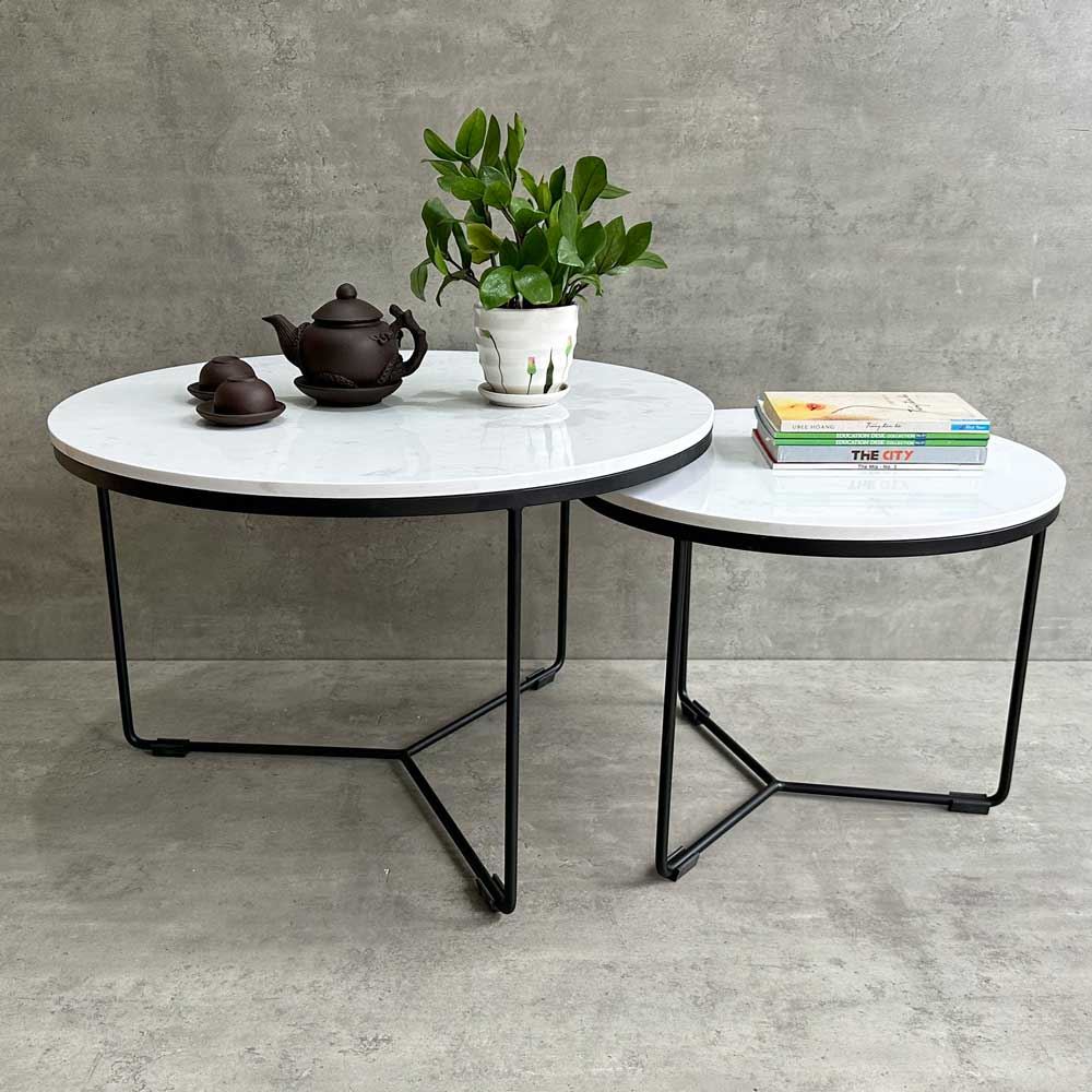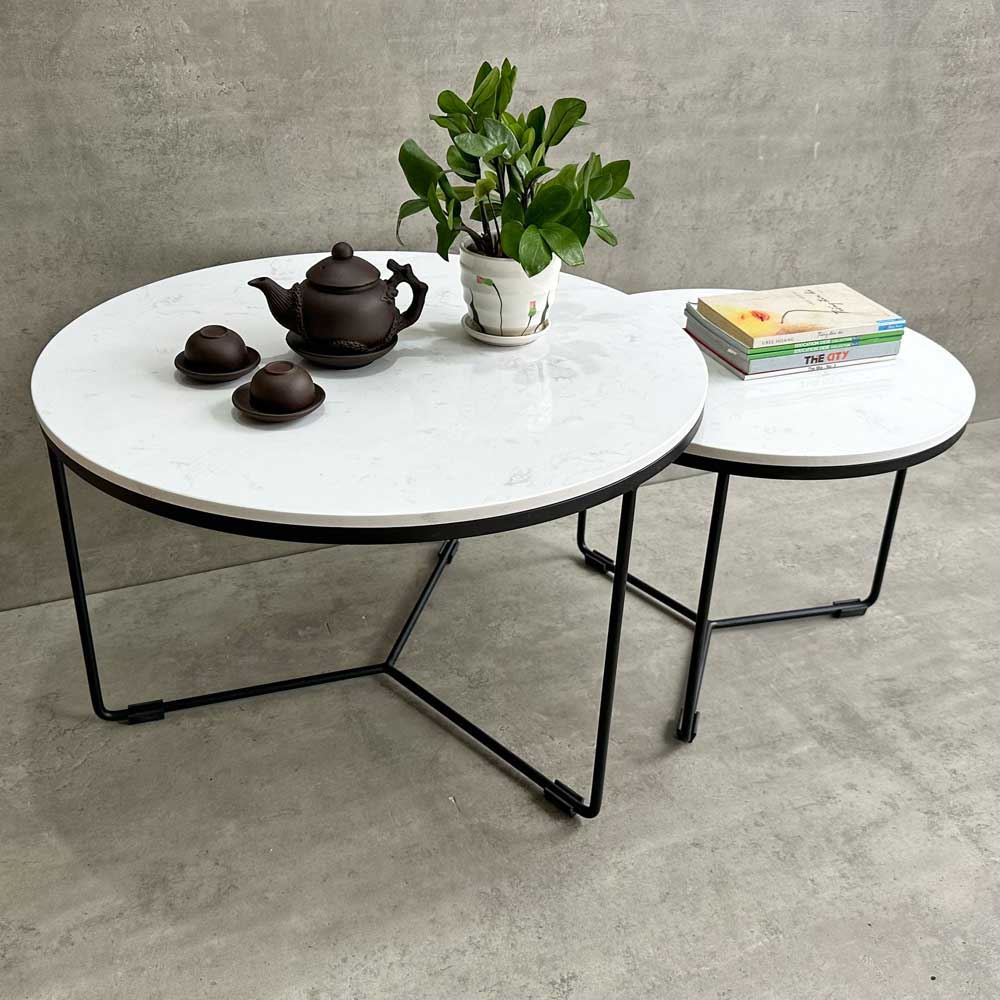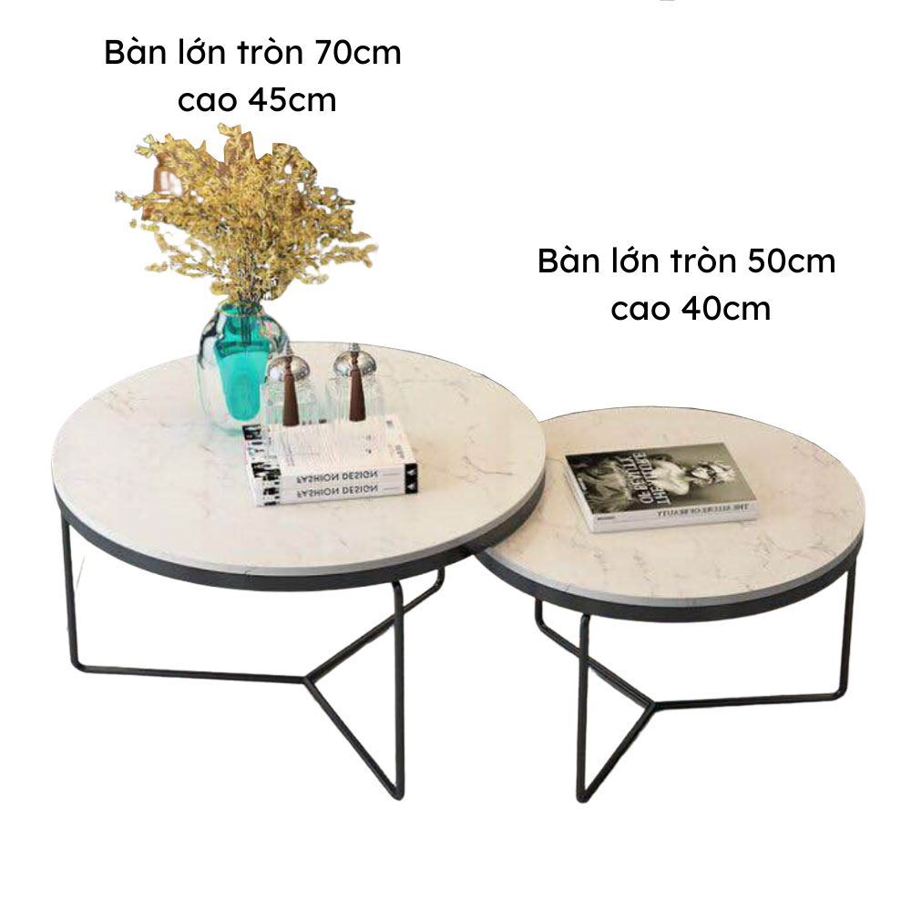 Bàn Sofa đôi mặt đá chân sắt TT68206 bộ bàn tròn chân sắt thiết kế hiện đại với mặt bàn được làm bằng đá nhân tạo dày 15mm với màu đá Trắng vân mây hoạc Đen vân mây rất sang trọng, kết hợp với khung chân sắt sơn tĩnh điện nhiều màu lựa chọn. Mặt bàn lớn kích tước tròn 70cm cao 45cm kết hợp với bàn nhỏ kích thước tròn 50cm và cao 40cm. Quý khách có thể tuỳ chọn các màu mặt bàn riêng đế phối cho phù hợp.