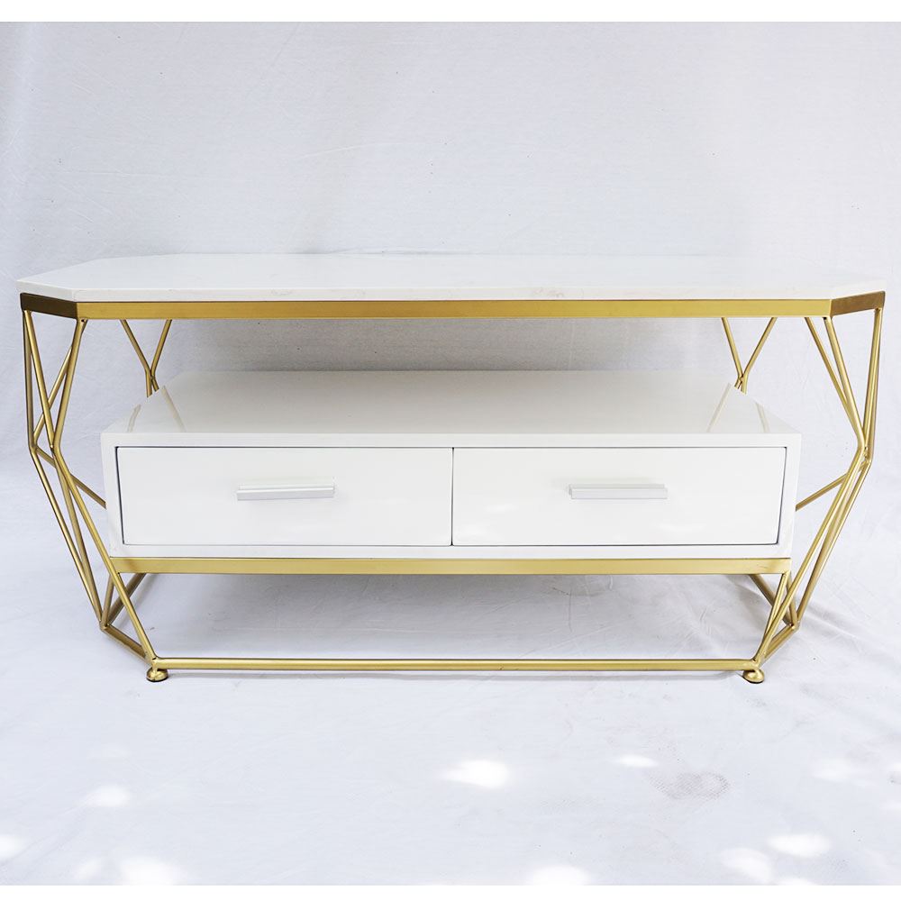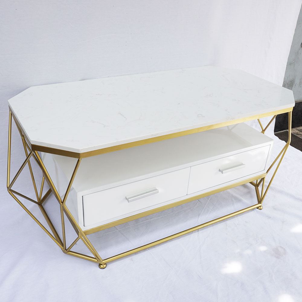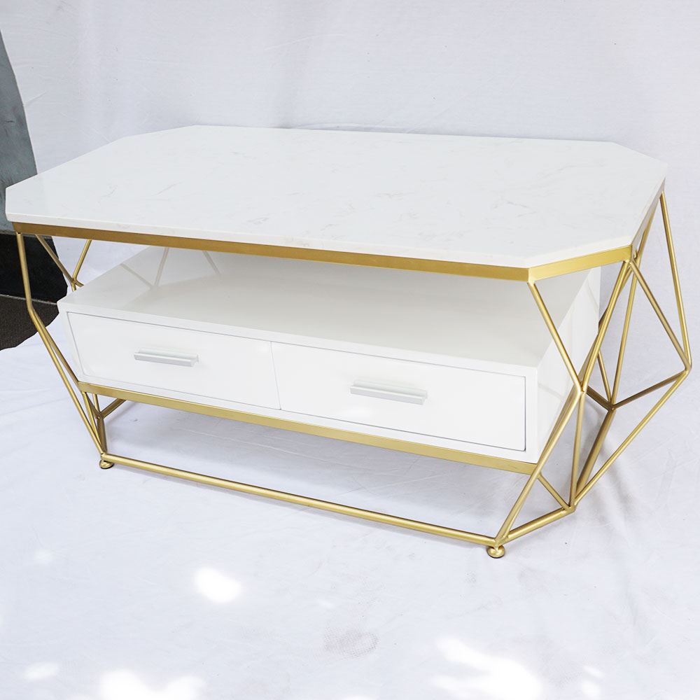 Bàn sofa mặt đá có hộc tủ khung màu vàng đồng TT68102 sở hữu kiểu dáng hiện đại mang đến không gian phòng khách sang trọng. Vật liệu chính mặt đá trắng cao cấp, chịu được những va chạm hàng ngày, hạn chế tối đa vết trầy xước. Kết hợp với mặt đá chính là khung sắt được ghép từ những thanh sắt tròn nhỏ cong 2 đầu móc ghép vào hai vòng tròn mặt đáy và mặt trên liền với bàn.
