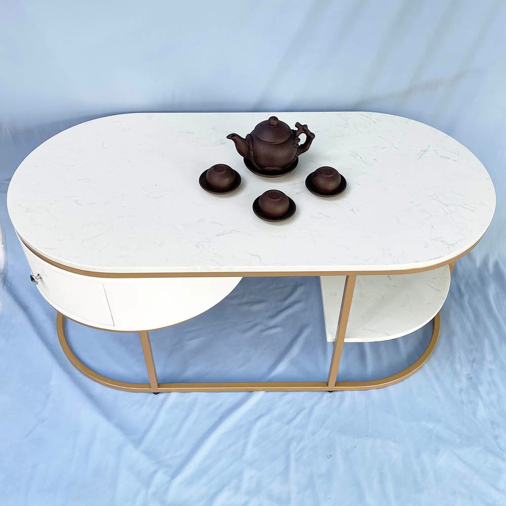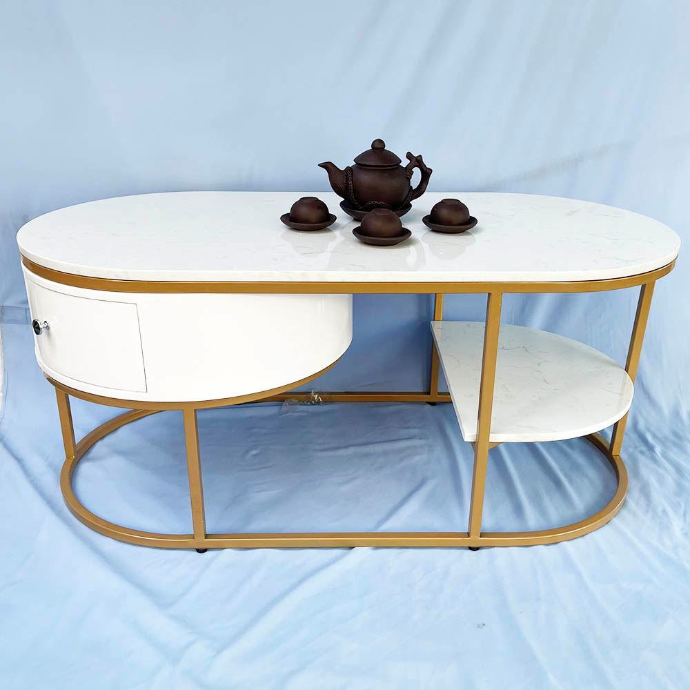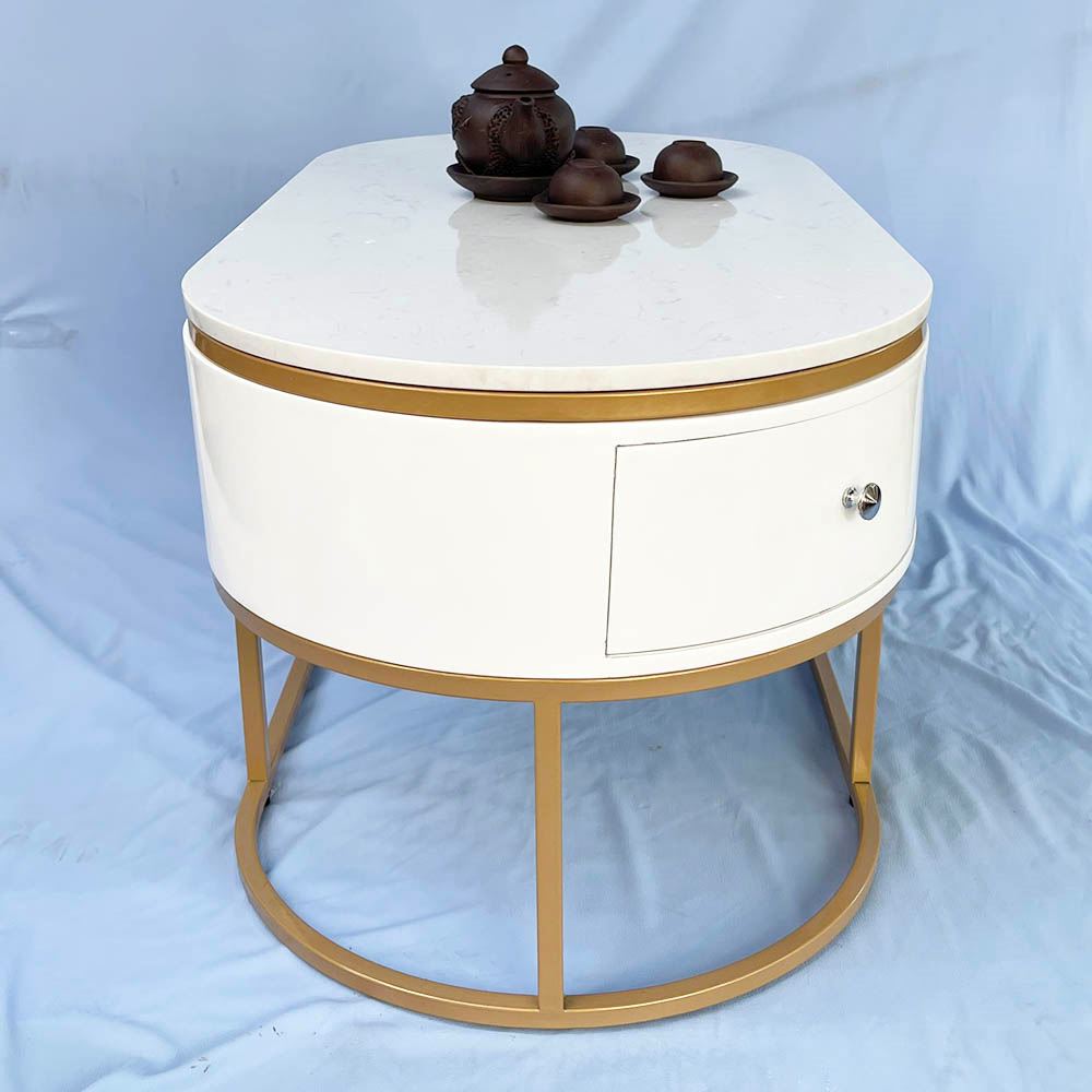 Bàn sofa oval có hộc tủ mặt đá khung sơn vàng