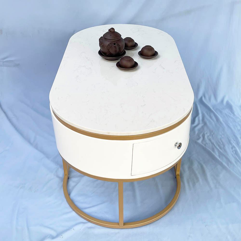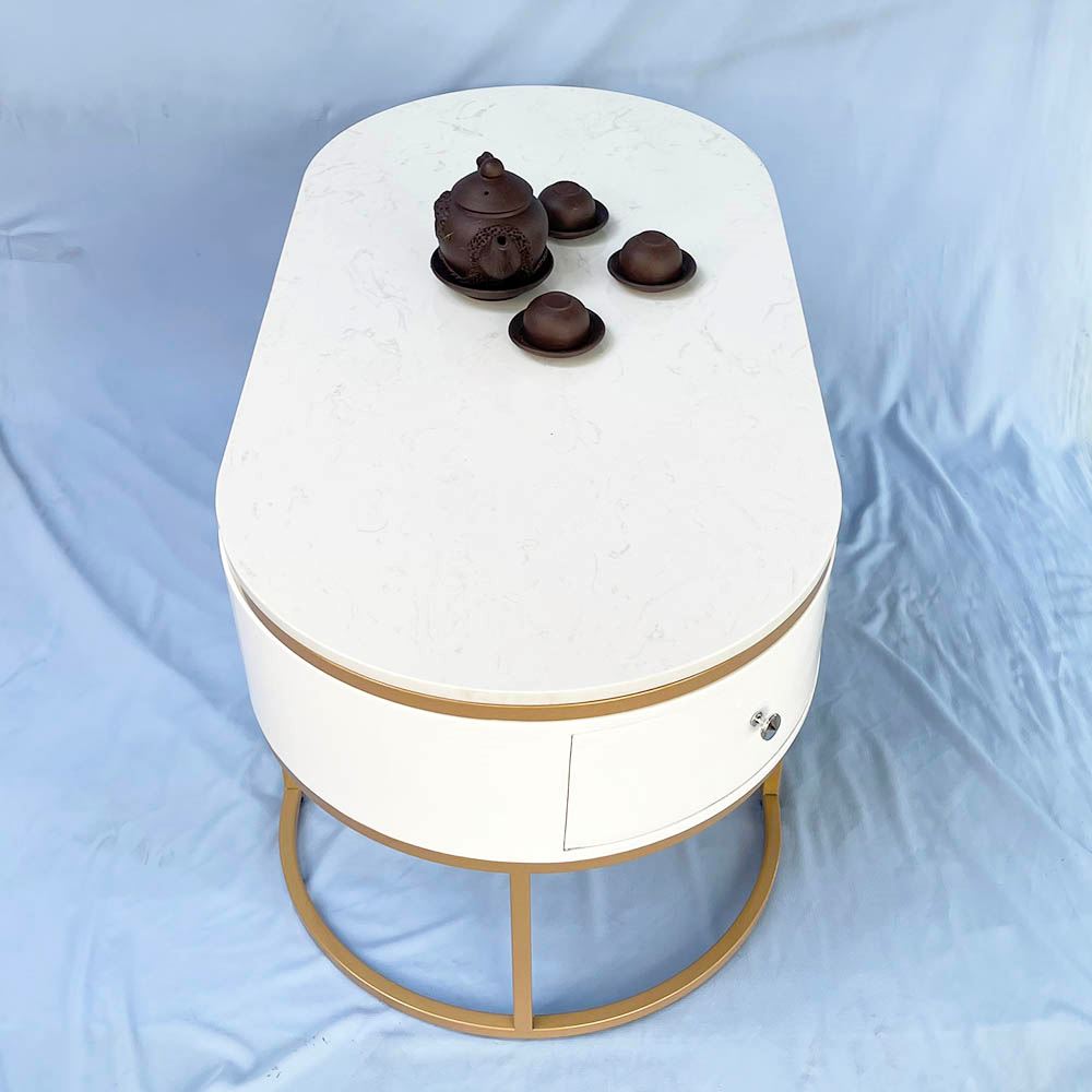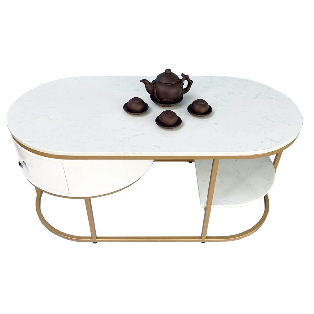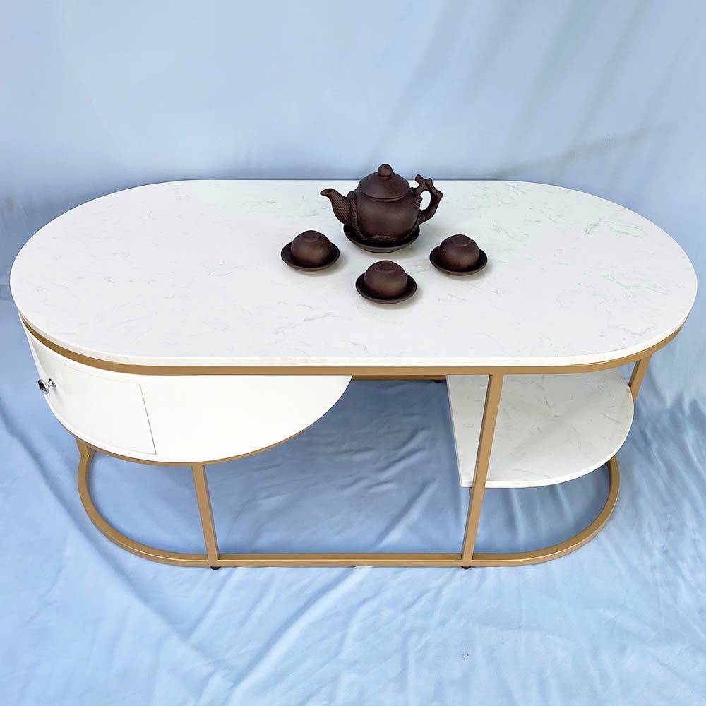 Bàn sofa oval có hộc tủ mặt đá khung sơn vàng