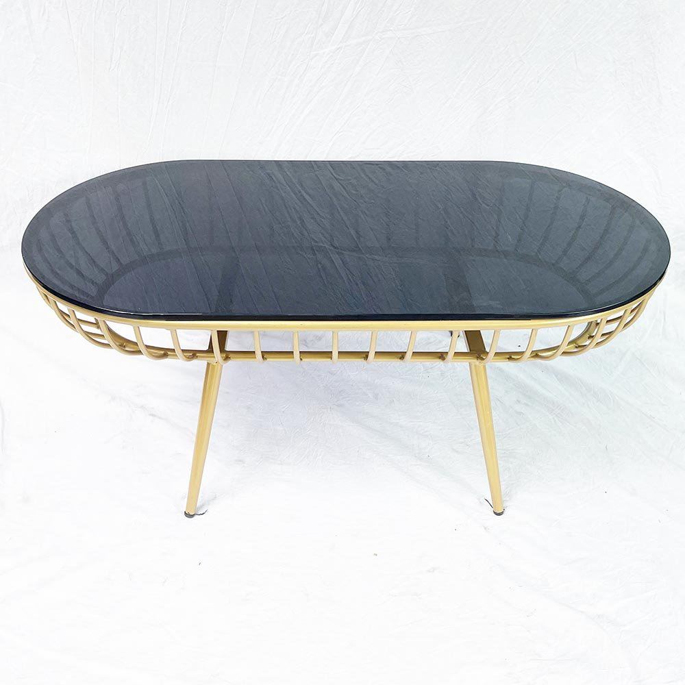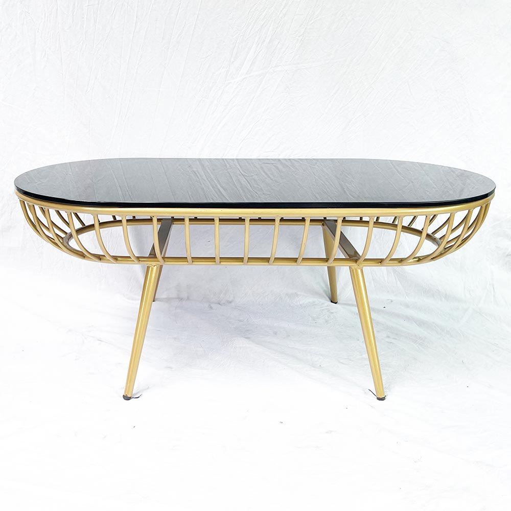 Bàn sofa oval mặt kính khung tròn màu vàng đồng TT68164 với mặt bàn kính cường lực đen có khả năng chịu lực tốt và dễ dàng vệ sinh khi dính nước. Kết hợp mặt bàn kính là khung sắt tròn uốn cong được gian công cẩn thận tỉ mỉ và hàn cố định chắc chắn, đặc biệt khung sơn màu vàng đồng đẹp mắt toát lên vẻ sang trọng giúp nâng tầm giá trị thẩm mỹ cho không gian phòng khách của bạn.