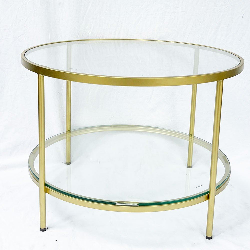 Bàn sofa tròn 2 tầng mặt kính khung vàng đồng TT68161 với mặt bàn có đường kính 60cm, thiết kế 2 tầng tăng gấp đôi không gian trưng bày và lưu trữ đồ đùng. Mặt bàn kính cường lực trắng có khả năng chịu lực tốt và dễ dàng vệ sinh khi dính nước kết hợp khung sắt sơn màu vàng đồng đẹp mang đến sự sang trọng cho không gian sử dụng.