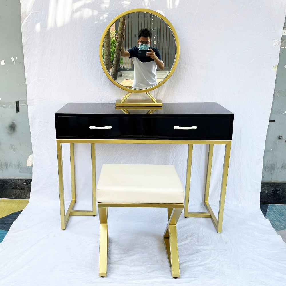 Bộ bàn trang điểm BTD68051 với đầy đủ 3 món gồm bàn, ghế và gương trên bàn với khung chân sắt sơn màu vàng đồng sang trọng, ghế chữ X nệm ngồi êm ái, khung gương tròn trên bàn di động màu vàng đồng, kích thước bàn nhỏ nhắn 40x100cm không chiếm nhiều diện tích với 2 hộc kéo giúp tăng khả năng lưu trữ rất tiện lợi.