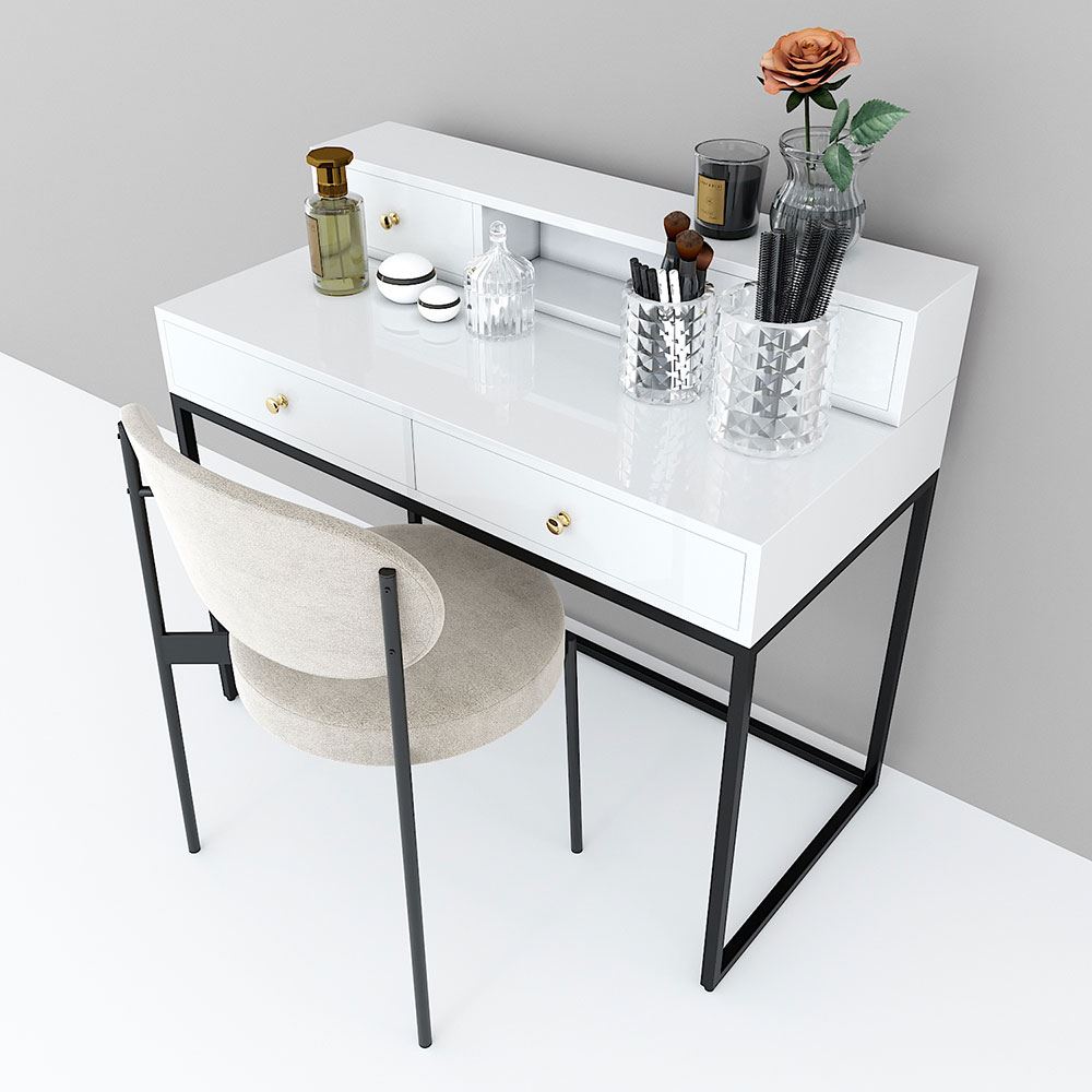 Bàn Trang Điểm chân sắt có kệ trên bàn BTD68045 mẫu bàn có kích thước 100x50cm nên có thể kết hợp làm bàn làm việc trong phòng ngủ, 2 hộc kéo trên bàn và dưới bàn giúp tăng khả năng lưu trữ đồ mỹ phần, đồ trang điểm dễ dàng, khung chân sắt đơn giản sử dụng sắt nhỏ vuông 20mm hàn cố định nên rất chắc chắn. Về chất liệu mẫu bàn sử dụng gỗ cao su tiêu chuẩn AA dày 17mm sơn PU nên rất bền bỉ với thời gian.