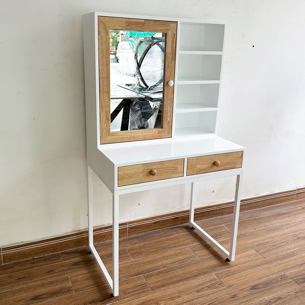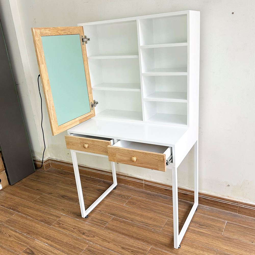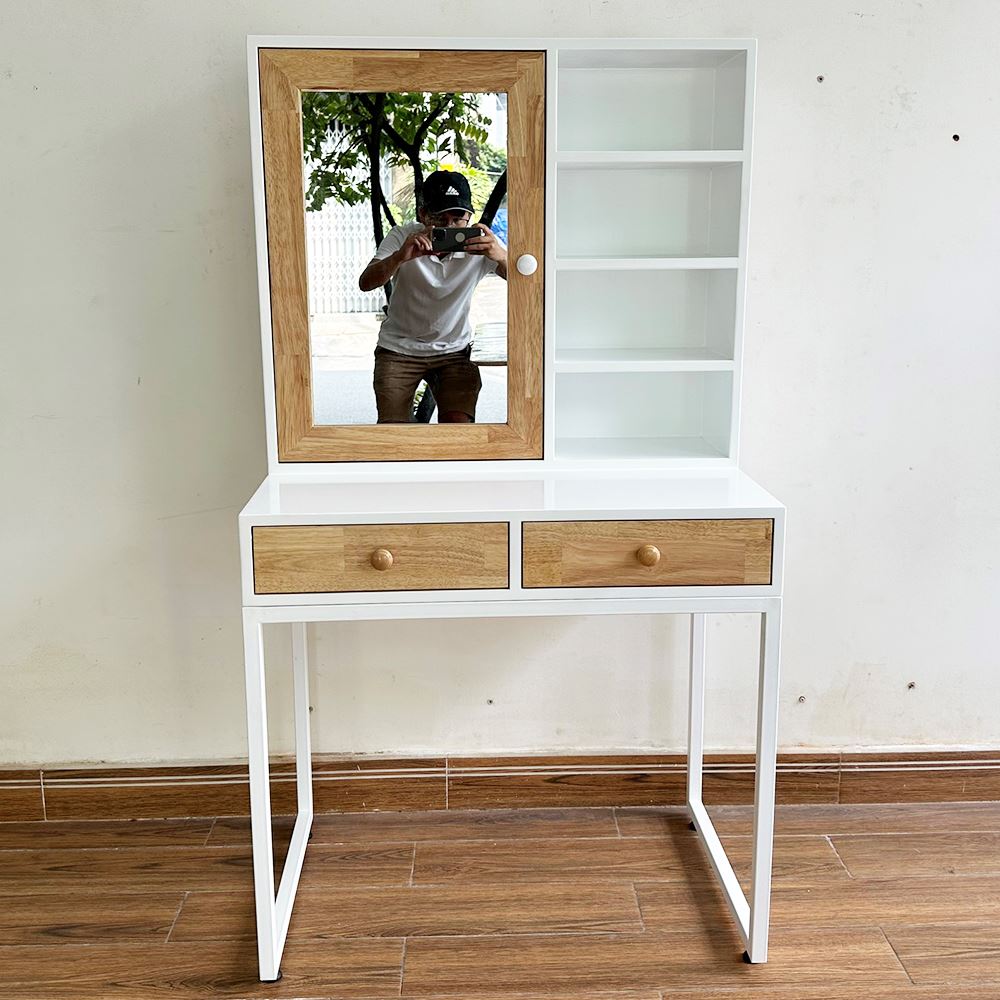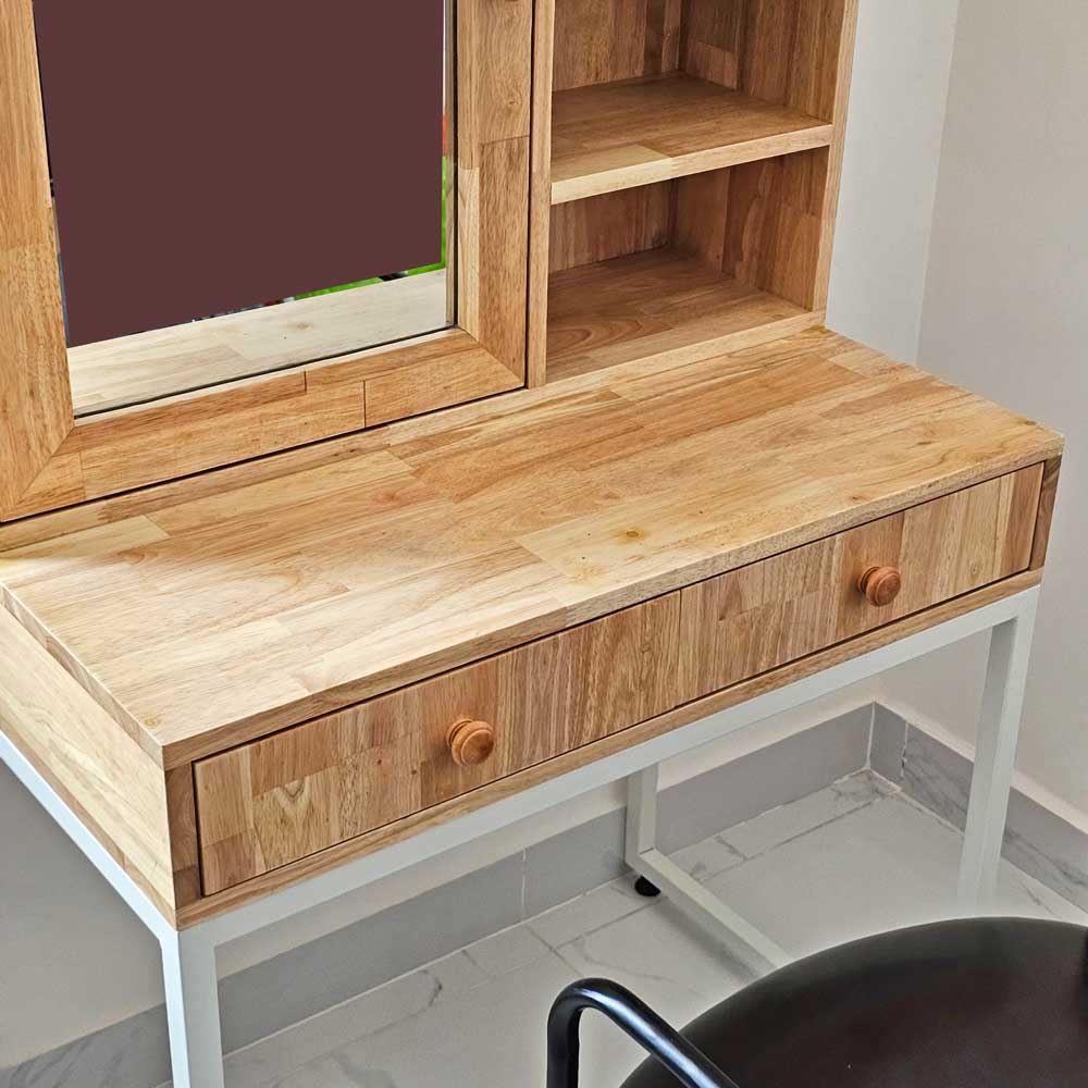 Bàn trang điểm có ngăn kéo kèm gương mở BTD68056 sử dụng chất liệu chính là gỗ cao su ghép tiêu chuẩn AA, sơn PU chống thấm, gỗ cao su sơn PU 5 màu khác nhau gíup bạn có được sự lựa chọn phù hợp với nhu cầu và sở thích bản thân. Khung chân sắt toát lên sự thanh mảnh, nhẹ nhàng nhưng không làm mất đi độ chắc chắn cần có, bề mặt sắt được phủ lớp sơn tĩnh điên cao cấp chống rỉ sét đảm bảo bộ bền cao.
