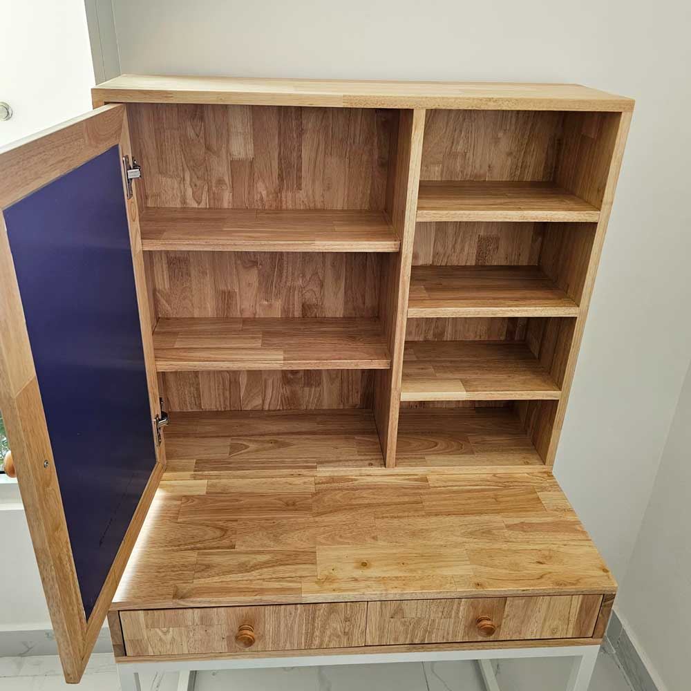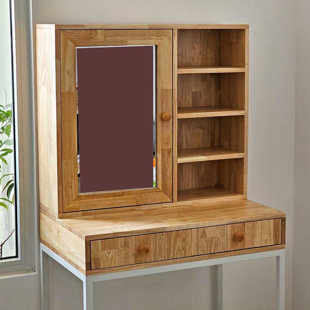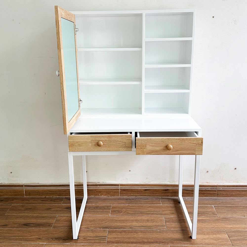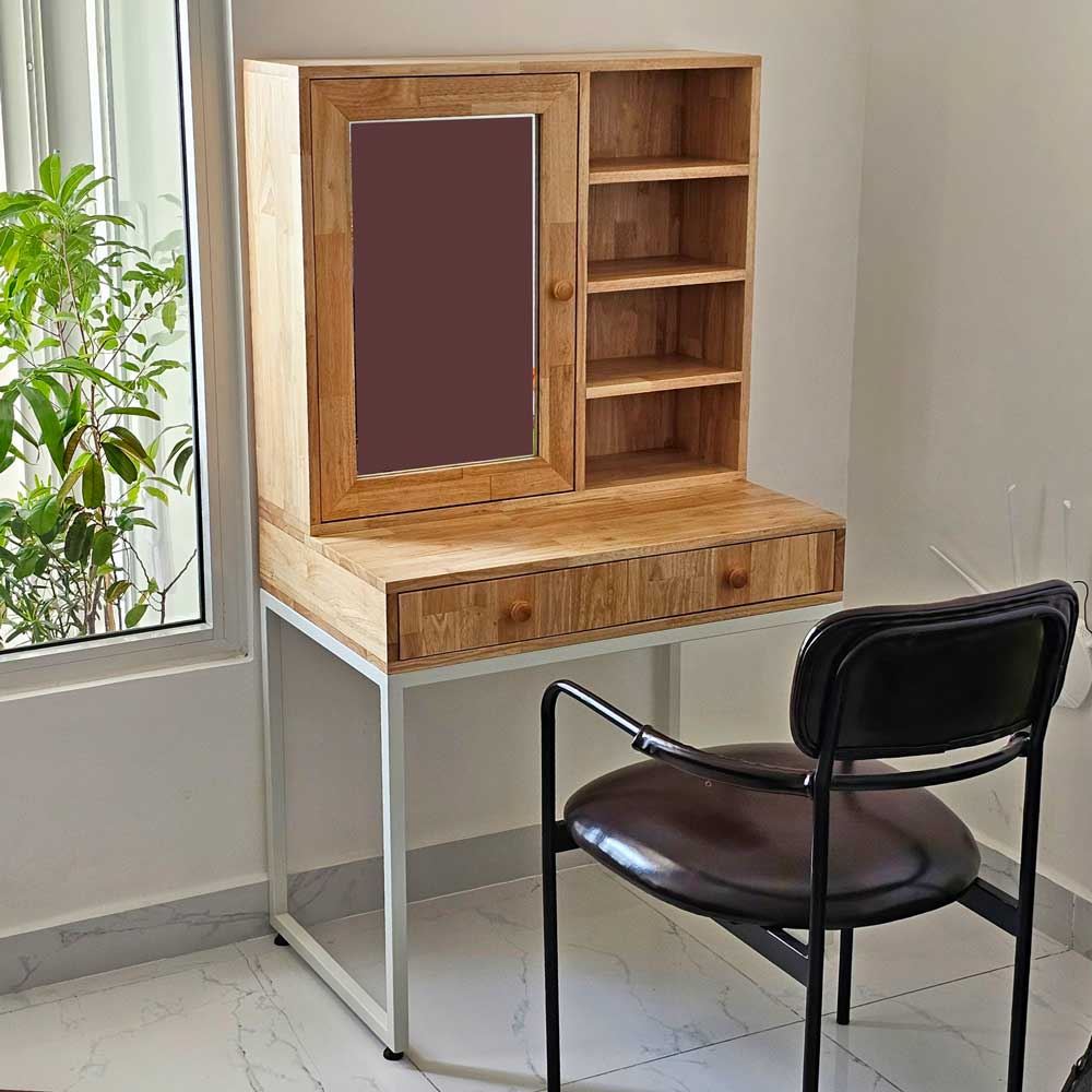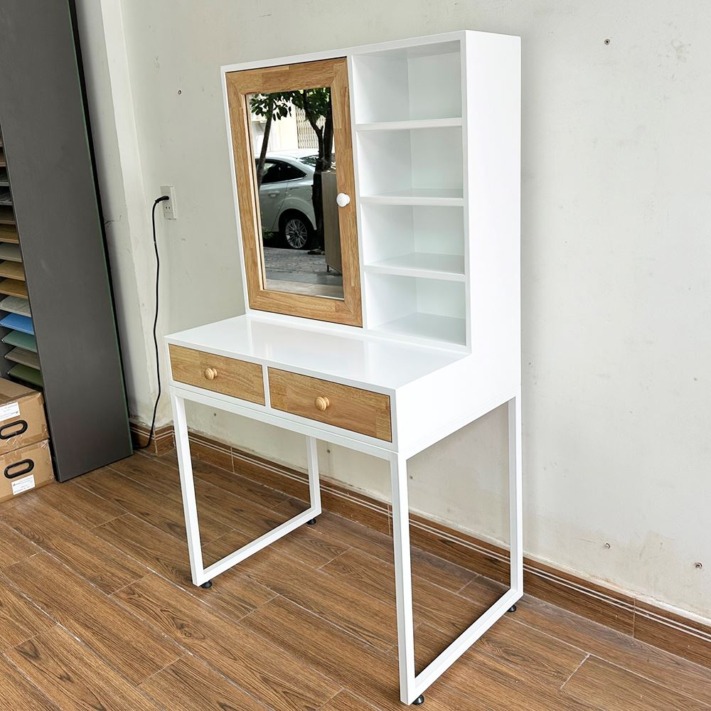 Bàn trang điểm có ngăn kéo kèm gương mở BTD68056 sử dụng chất liệu chính là gỗ cao su ghép tiêu chuẩn AA, sơn PU chống thấm, gỗ cao su sơn PU 5 màu khác nhau gíup bạn có được sự lựa chọn phù hợp với nhu cầu và sở thích bản thân. Khung chân sắt toát lên sự thanh mảnh, nhẹ nhàng nhưng không làm mất đi độ chắc chắn cần có, bề mặt sắt được phủ lớp sơn tĩnh điên cao cấp chống rỉ sét đảm bảo bộ bền cao.