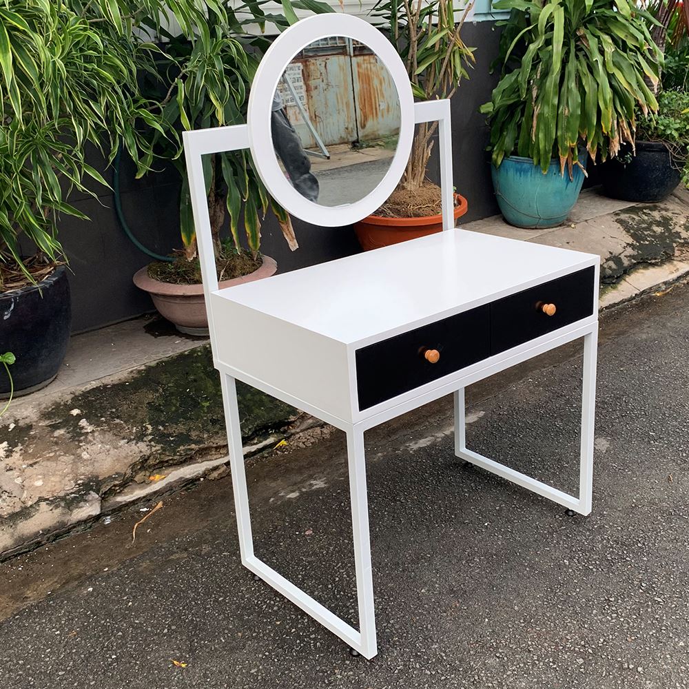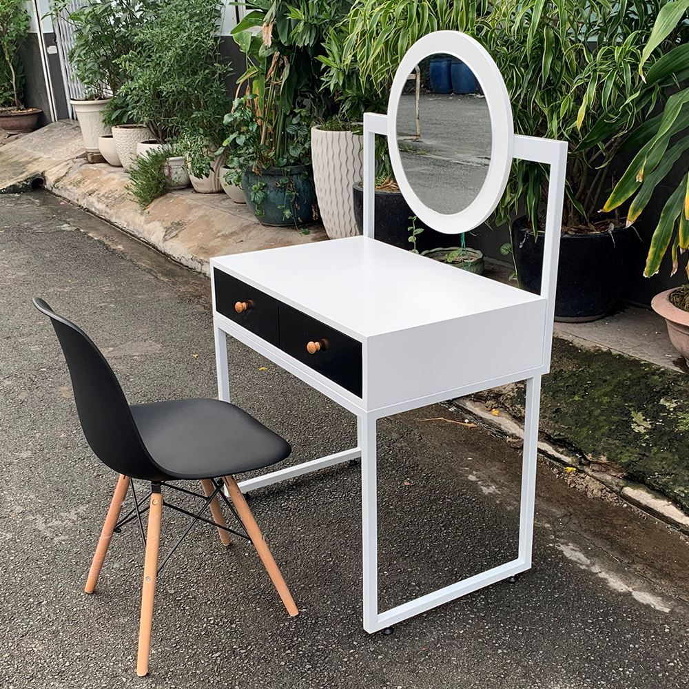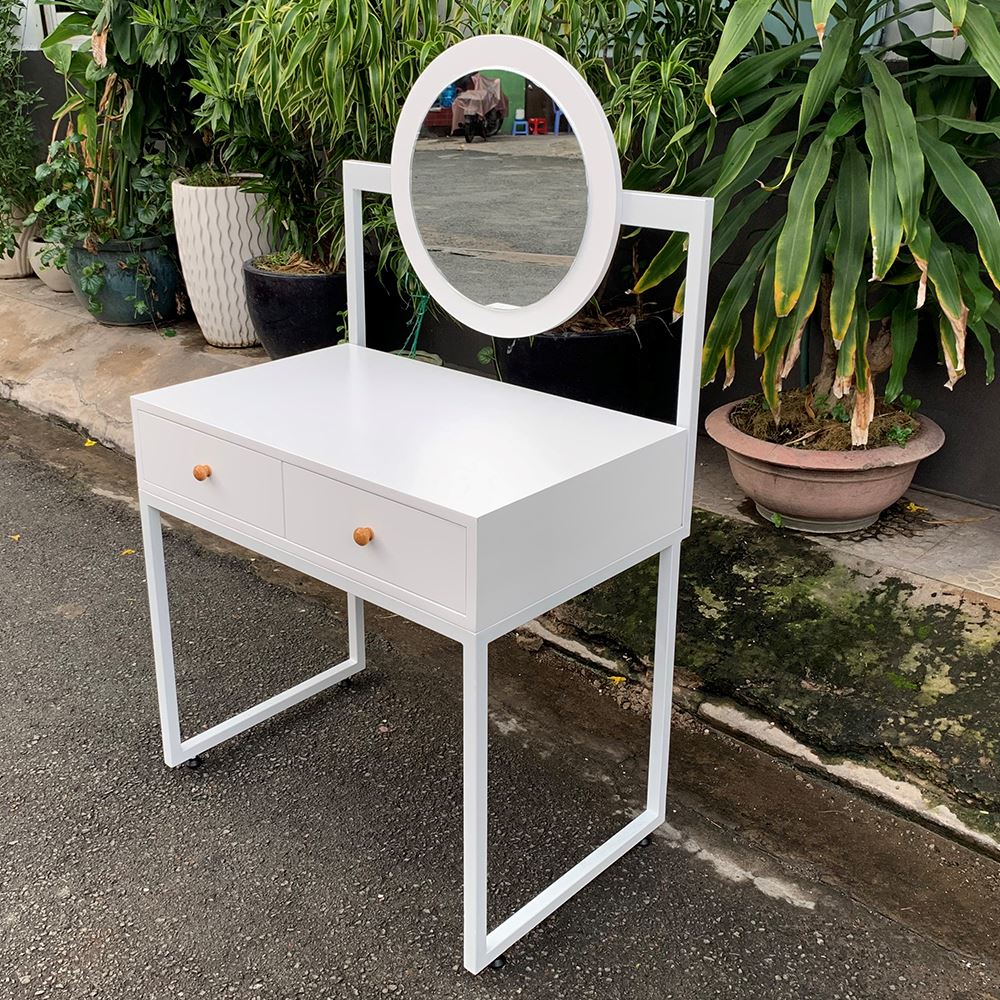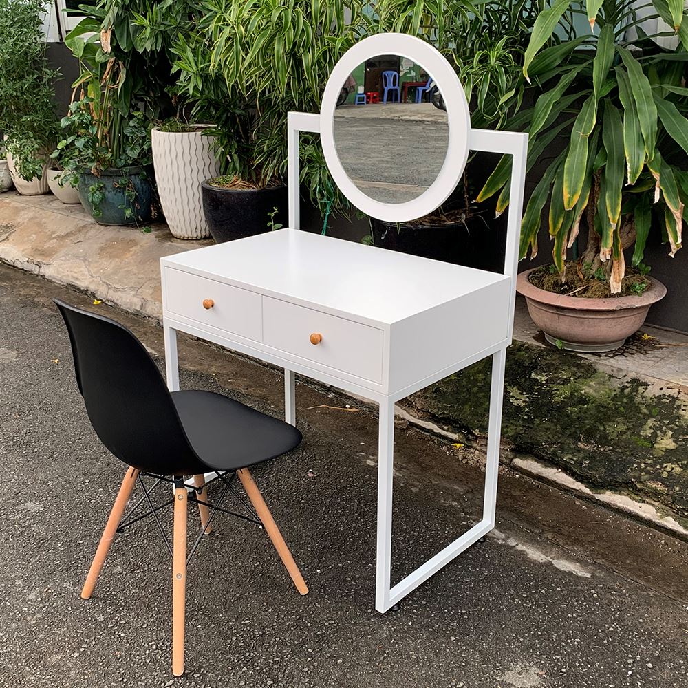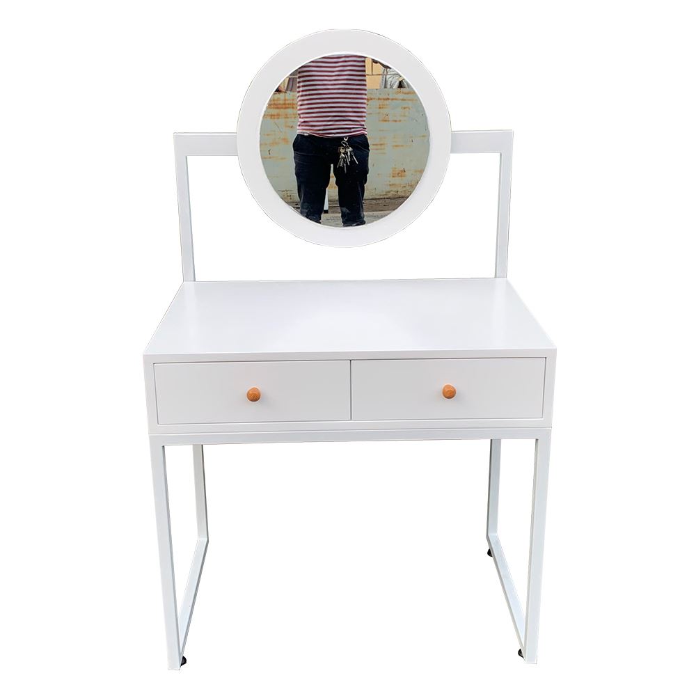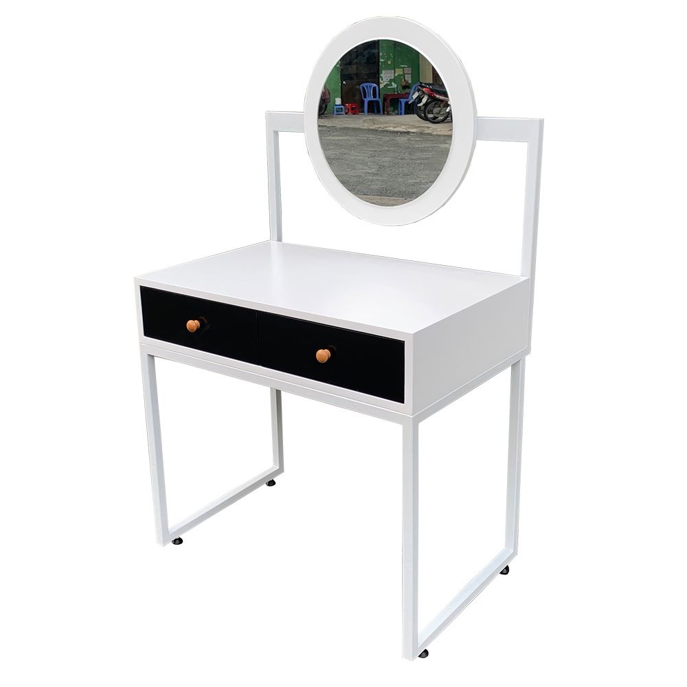 Bàn trang điểm Full trắng 2 hộc kéo chân sắt gương tròn BTD68019