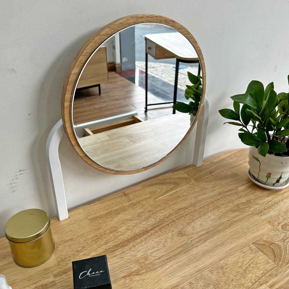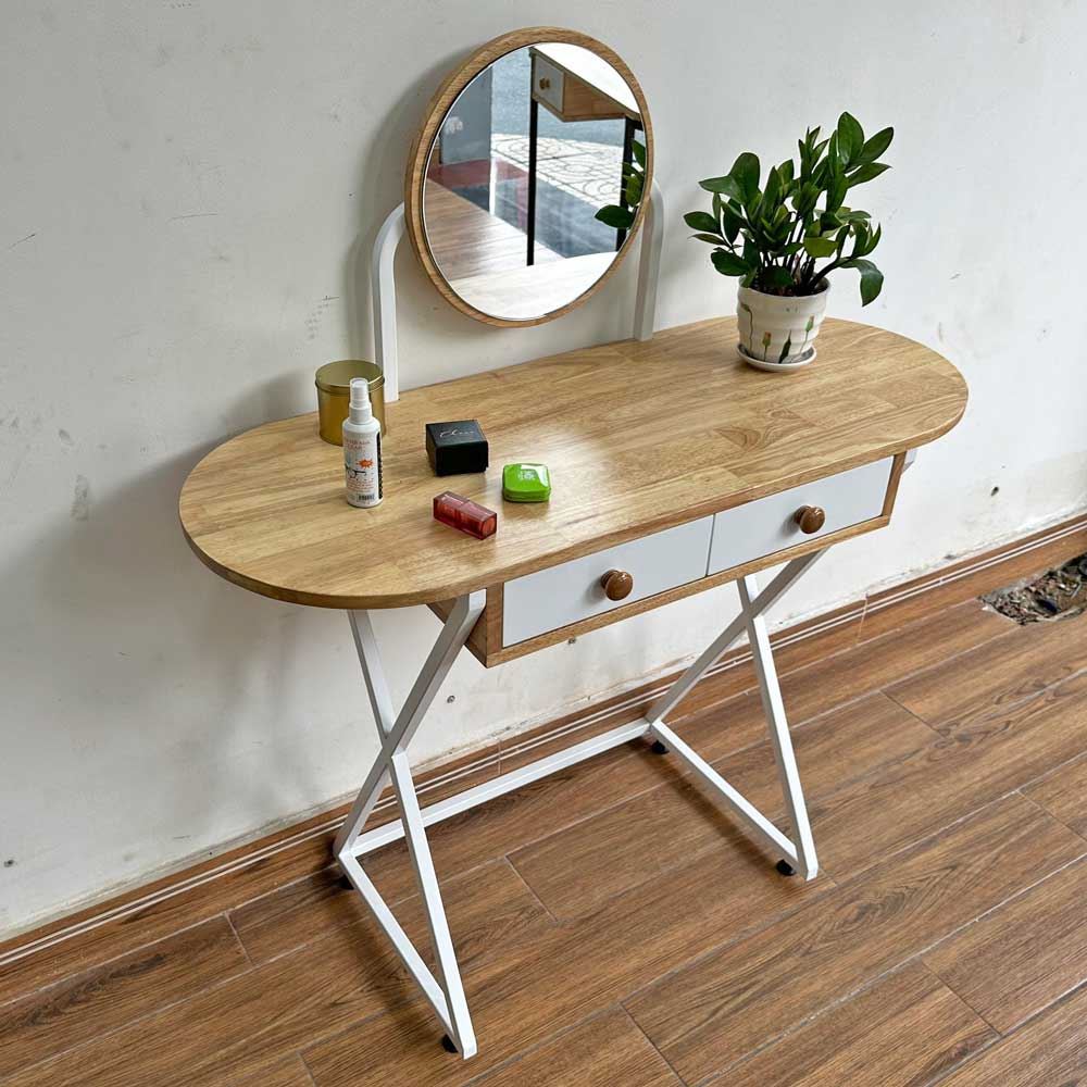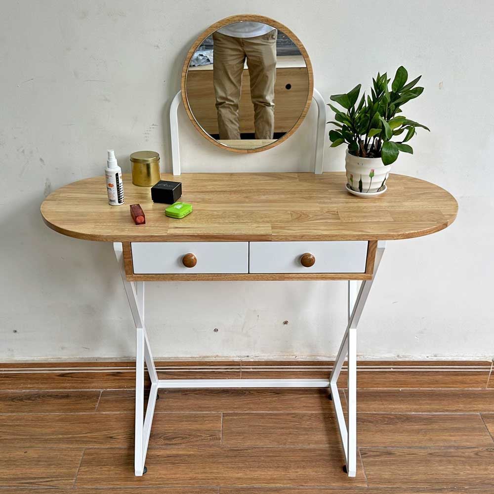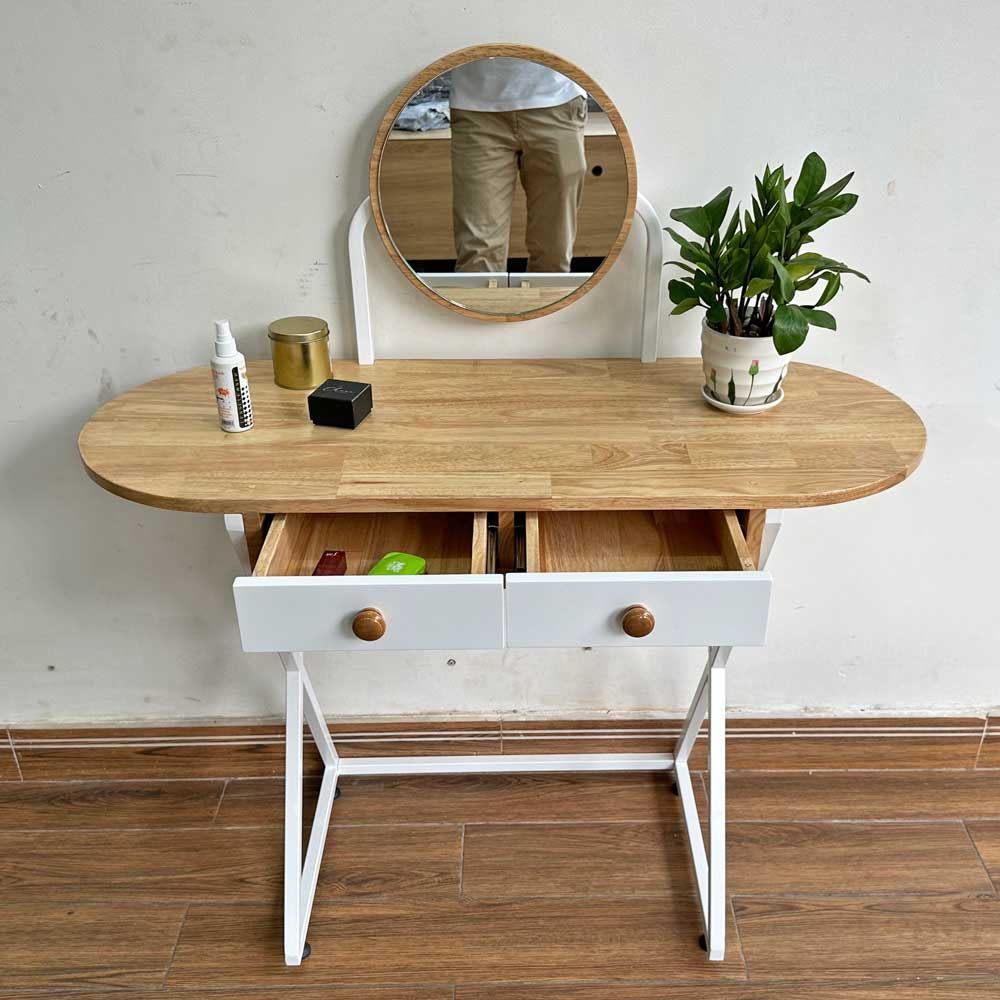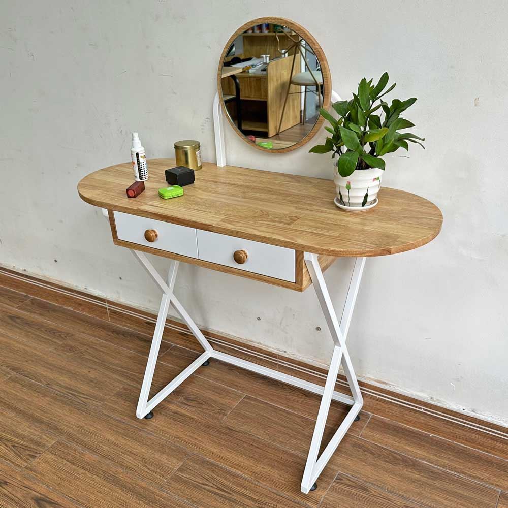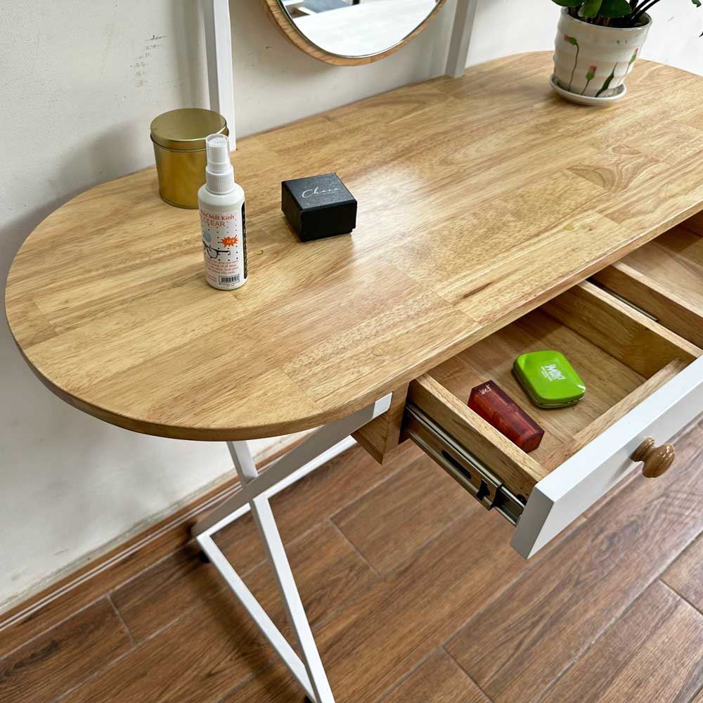 Bàn trang điểm BTD68061 sử chất liệu chính là gỗ cao su ghép, đạt tiêu chuẩn xuất khẩu AA. Bề mặt gỗ đã được xử lý bằng sơn PU chống thấm. Ngoài ra, bạn có thể lựa chọn 5 màu khác tùy thích, phù hợp với nhiều không gian và phong cách mà cá nhân đang hướng tới. Khung chân sắt được hoàn thiện cẩn thận, mang nét thanh mảnh nhưng vẫn đảm bảo sự chắc chắn và ổn định. Bề mặt sắt được phủ lớp sơn tĩnh điên cao cấp chống rỉ sét, chống trầy, đảm bảo bộ bền bỉ theo thời gian.