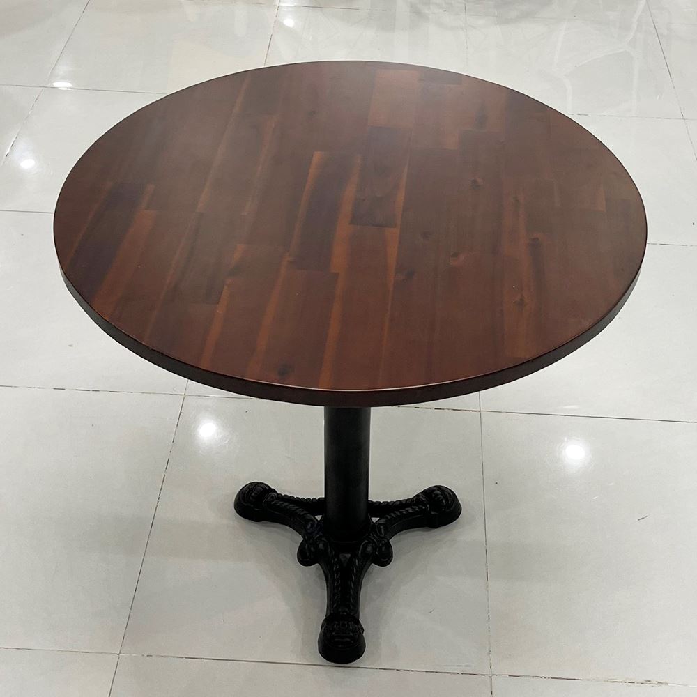 Bàn ăn tròn 80cm BA68093 với chân sắt tròn đế gang đúc 3 chĩa đẹp mắt kết hợp với mặt bàn gỗ tràm tự nhiên dày 25mm được xử lý và hoàn thiện chống thấm nước, chống cong vênh bền bỉ theo thời gian. Mẫu bàn phù hợp làm bàn ăn nhỏ gia đình, bàn cafe hay bàn nhà hàng đều được, cũng có thể làm bàn tiếp khách trong văn phòng.