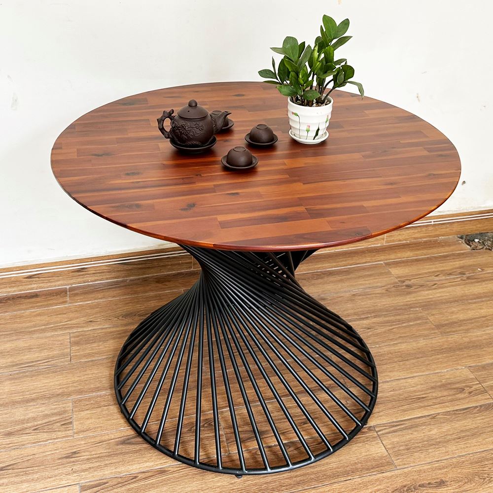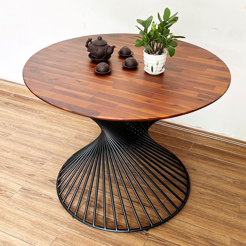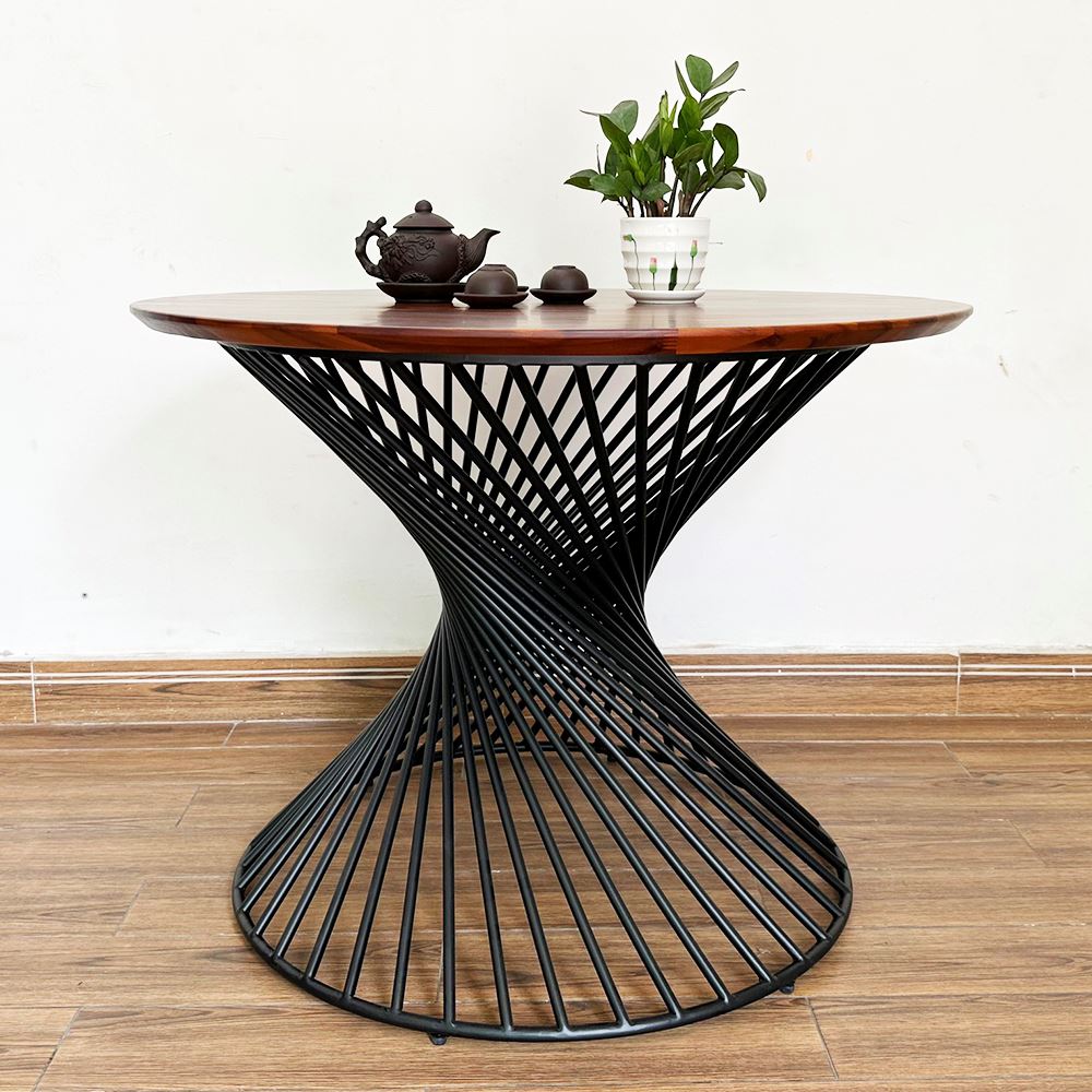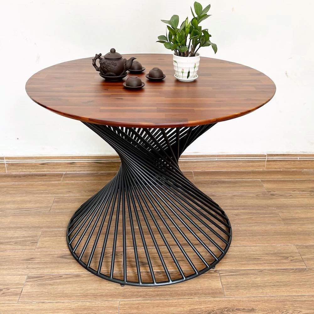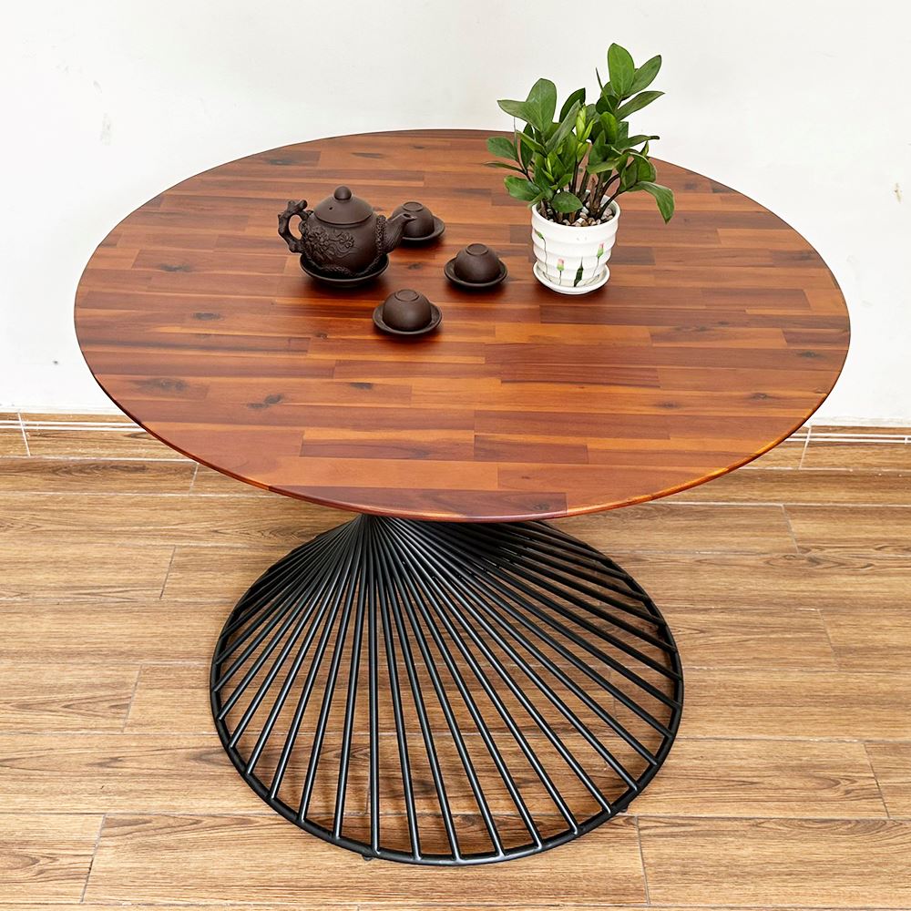 Bàn tròn gỗ Tràm chân sắt tròn BA68144 là mẫu bàn sở hữu kiểu dáng vô cùng bắt mắt, điểm nhấn nằm ở chân sắt được thiết kế với phần chân bàn là các thanh sắt tròn đan xen theo hình tròn uốn lượn độc đáo. Kết hợp với chân bàn sắt là mặt bàn làm từ gỗ tràm 25mm tiêu chuẩn AA được xử lý PU hoàn thiện cho bề mặt sản phẩm rất đẹp mắt, chống nước tuyệt đối rất dễ dàng lau khi mặt bàn dính nước.