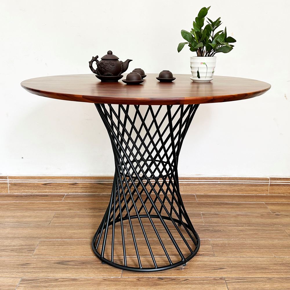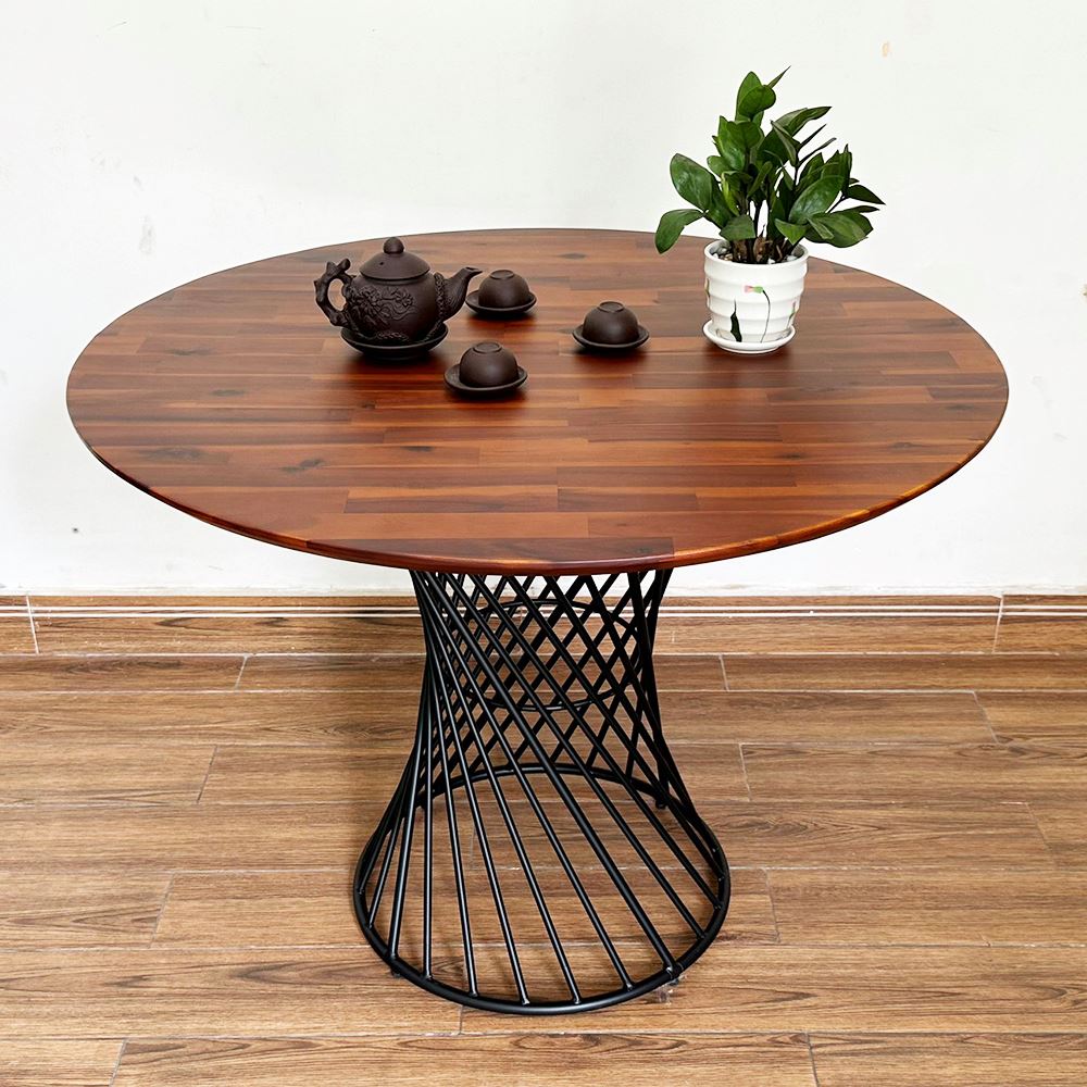Bàn tròn 1m gỗ Tràm chân sắt tròn BA68145 là mẫu bàn sở hữu kiểu dáng vô cùng bắt mắt, điểm nhấn nằm ở chân sắt được thiết kế với phần chân bàn là các thanh sắt tròn đan xen theo hình tròn uốn lượn độc đáo. Kết hợp với chân bàn sắt là mặt bàn làm từ gỗ tràm 25mm tiêu chuẩn AA được xử lý PU hoàn thiện cho bề mặt sản phẩm rất đẹp mắt, chống nước tuyệt đối rất dễ dàng lau khi mặt bàn dính nước.