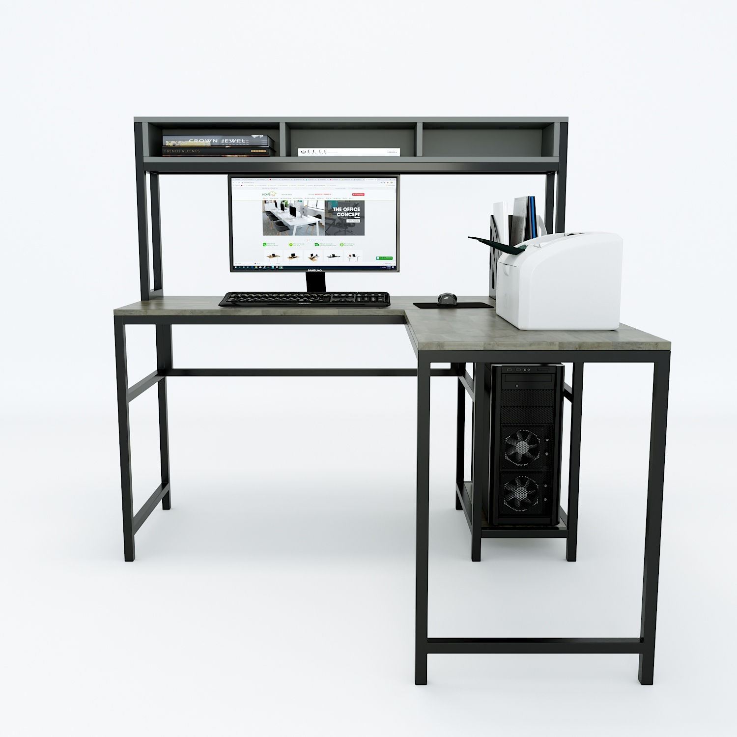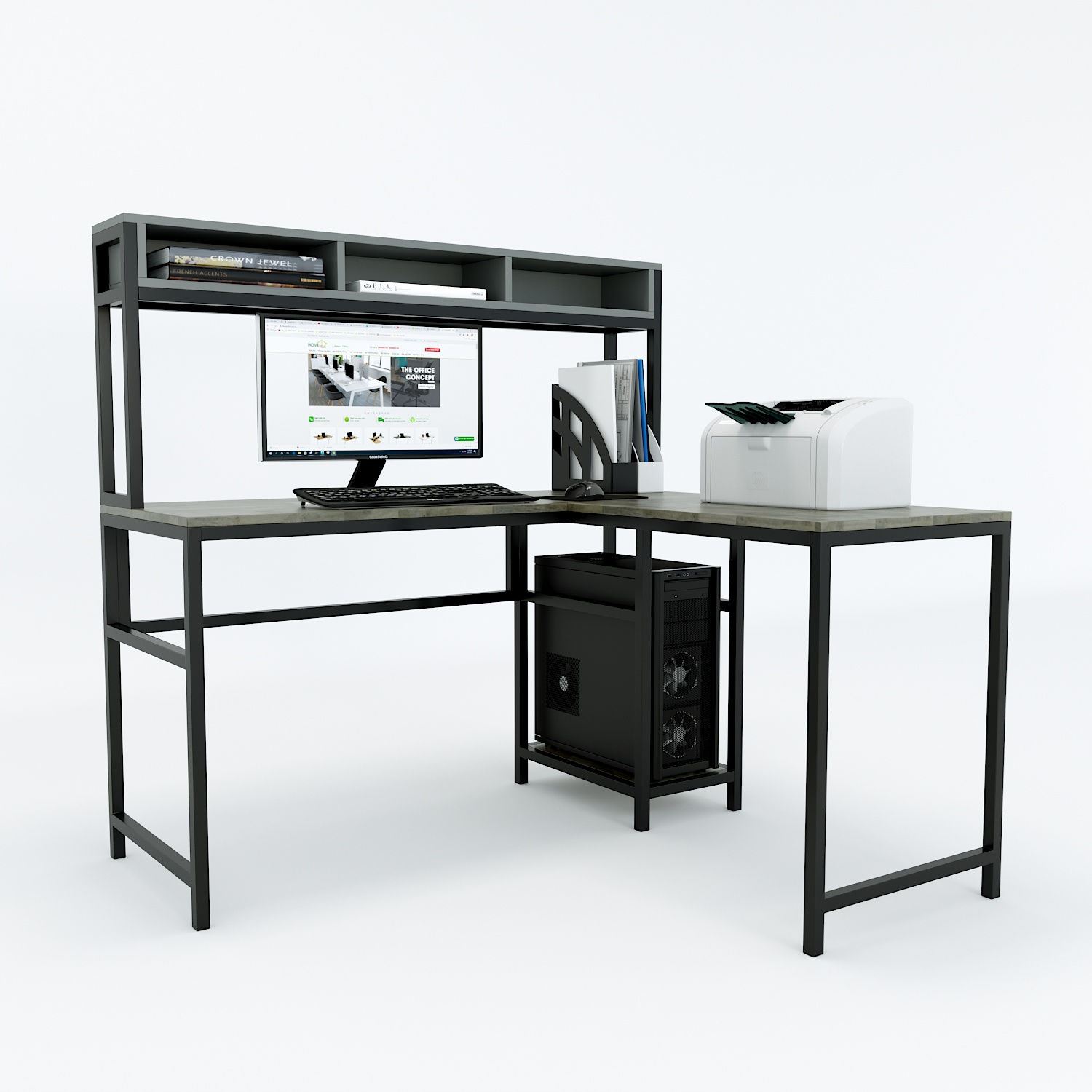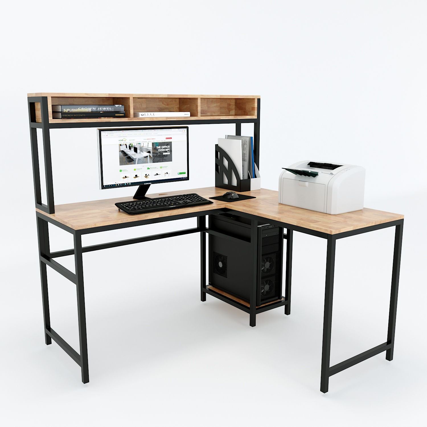 COD68037 - Bàn vi tính góc chữ L kết hợp kệ (120x130x133cm) kết hợp gòm kệ để CPU, kệ sách trang trí, bàn góc chữ L tạo nên chiếc bàn đa công năng với chất liệu mặt bàn và kệ gỗ cao su tiêu chuẩn AA dày 17mm sơn PU hoàn thiện với nhiều màu sắc lựa chọn, hệ khung chân sắt hộp sơn tĩnh điện chất lượng cao, lắp ráp. Mẫu bàn kết hợp gồm 1 bàn và 1 kệ rời để CPU và máy in, kích thước bề mặt bàn rộng 50cm phù hợp với nhiều không gian và mục đích sử dụng