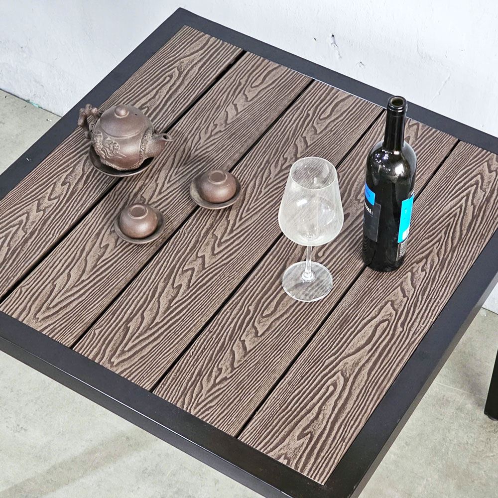 Mặt bàn được làm bằng chất liệu gỗ nhựa composite với khả năng chịu nước tuyệt đối, không bị cong vênh hay mục nát dưới tác động của thời tiết. Khả năng chịu nhiệt tốt giúp bàn không bị biến dạng hay phai màu dưới ánh nắng mặt trời gay gắt. Bề mặt được dập nổi vân gỗ 3D tinh xảo, mang lại cảm giác chân thực như đang chạm vào gỗ thật, đồng thời tăng tính thẩm mỹ cho sản phẩm. Khung bàn được làm từ sắt hộp dày 1.2mm, hàn cố định chắc chắn, đảm bảo độ vững chãi và khả năng chịu lực cao. Lớp sơn tĩnh điện cao cấp không chỉ bảo vệ khung bàn khỏi sự ăn mòn, gỉ sét mà còn mang lại vẻ đẹp thẩm mỹ, bền bỉ theo thời gian.
