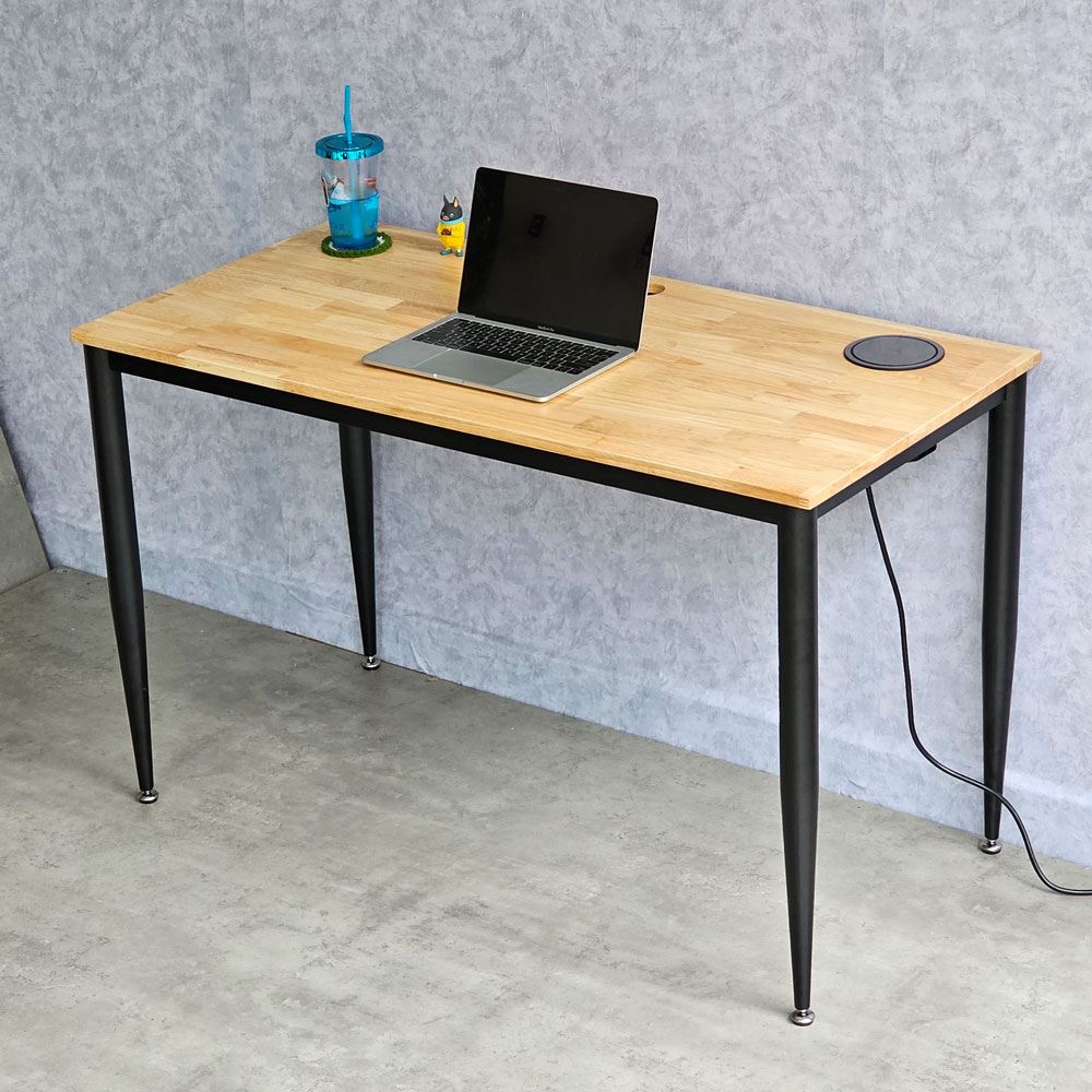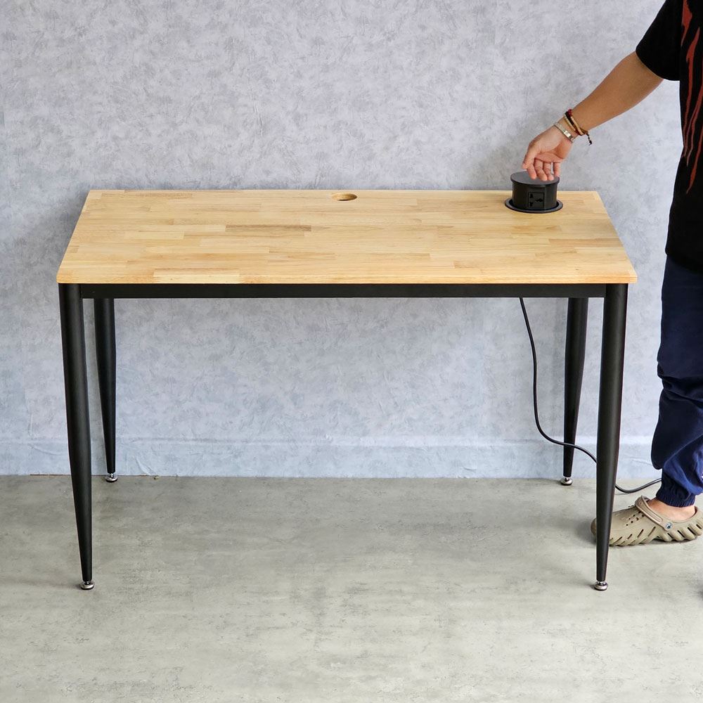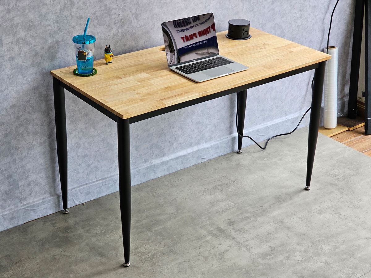 Mặt bàn được làm bằng vật liệu chính được chúng tôi lựa chọn và sử dụng là gỗ cao su AA, loại dày 17mm, đã được xử lý qua xấy công nghệ giúp tăng khả năng chống thấm và chống cong vênh. Bề mặt gỗ đã được xử lý PU giúp tăng tính thẩm mỹ và chống thấm nước. Kết hợp với mặt gỗ bàn là hệ khung chân bàn sử dụng cơ cấu lắp ráp ngàm chắc chắn, bề mặt phủ lớp sơn tĩnh điện hạn chế tối đa ăn mòn hoá học, lớp sơn tĩnh điện nâng cao tuổi thọ sản phẩm. Mỗi sản phẩm được hoàn thiện cẩn thận, tỉ mỉ từ công đoạn thiết kế.