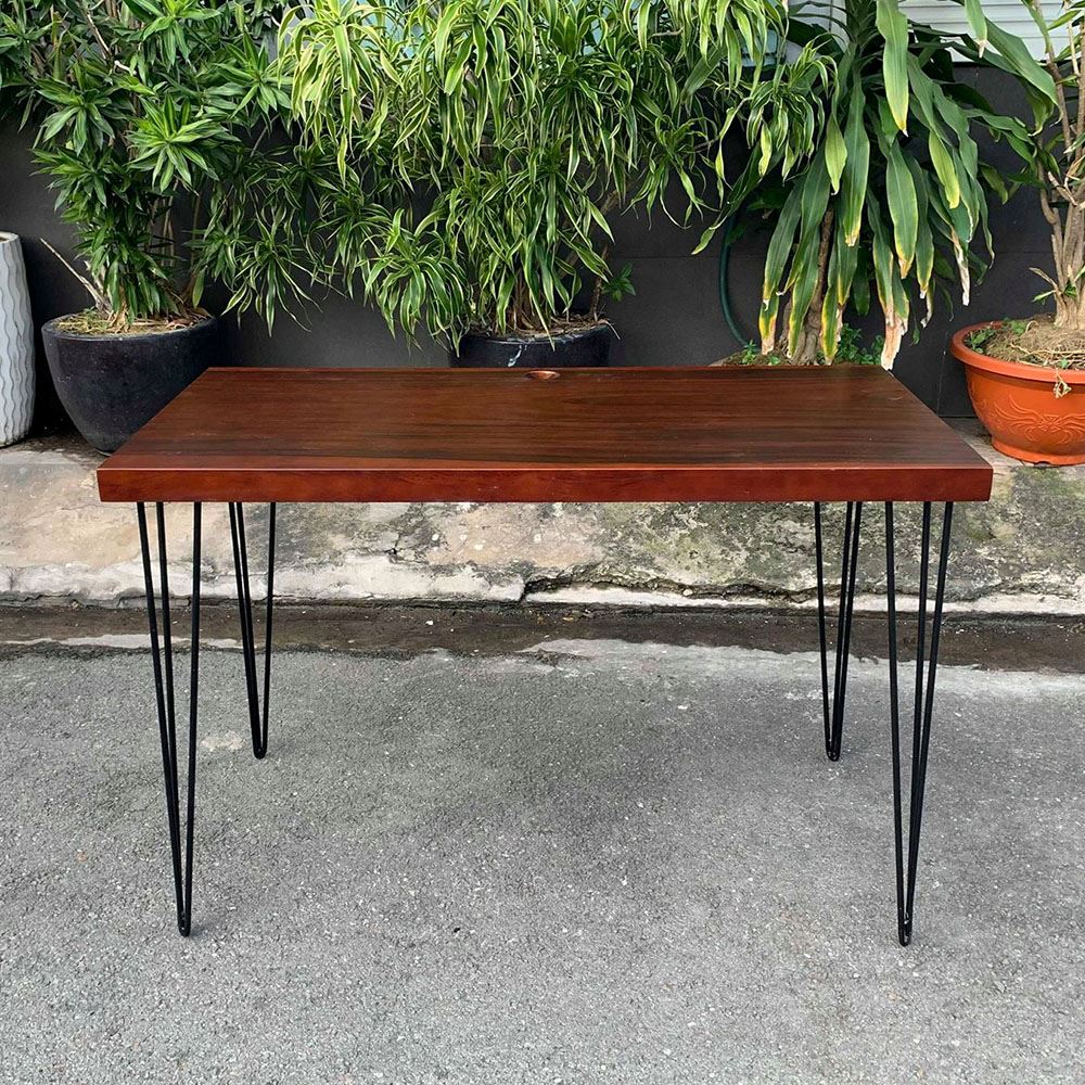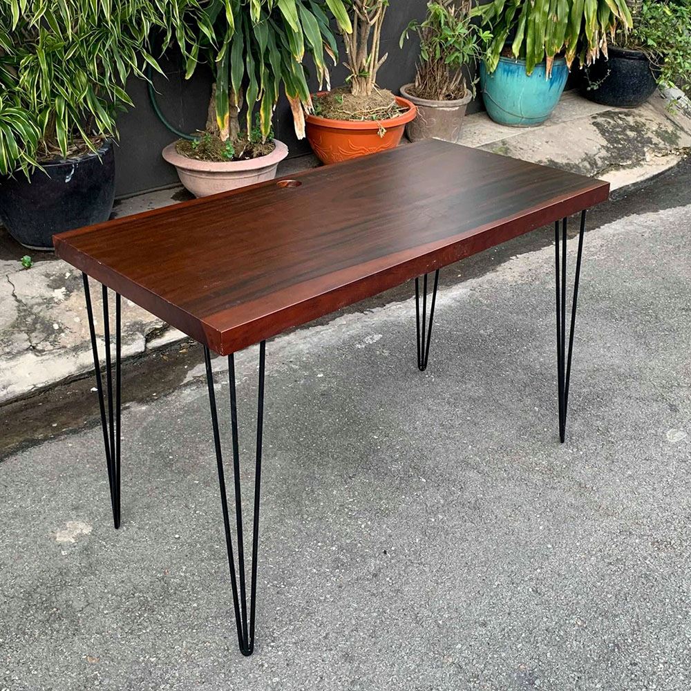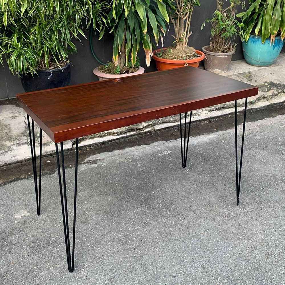 BMT010 - Bàn gỗ Me Tây dày 5cm chân Hairpin PU màu cánh gián. Mãu sản phẩm mới với chất liệu gỗ me tây, là loại gỗ mang lại cho người nhìn ắn tượng đầu tiên đó chính là vẻ đẹp từ các vân gỗ cùng với những đặc tính vô cùng nổi trội. Bàn làm việc gỗ me tây chắc chắn sẽ là một lựa chọn tuyệt vời cho những phòng làm việc mang thiên hướng cổ điển.