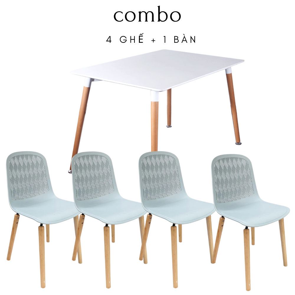 Bộ bàn ăn 120cm và 4 ghế CBBA064 là sự kết hợp của Bàn ăn 120cm hình chữ nhật chân gỗ BA68001 và 4 Ghế cafe lưng nhựa chân gỗ ST3003C đều với thiết kế chân gỗ kiểu Eames nổi tiếng đang được ưa chuộng. Bàn kích thước 120x80cm vừa vặn với nhiều không gian, ghế lưng nhựa PP siêu bền kết hợp khung sắt và chân gỗ rất chắc chắn.