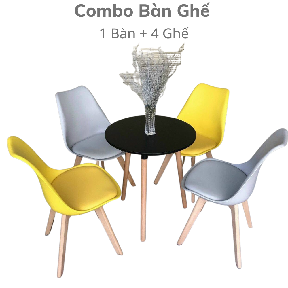 Bộ bàn cafe tròn chân gỗ và 4 ghế nệm nhiều màu CBCF167 là bộ sản phẩm bao gồm 1 bàn tròn 60cm chân gỗ và 4 ghế Eames nệm nhiều màu chân gỗ, kiểu dáng tối giản tinh tế có thể sử dụng trong nhiều không gian và mục đích khác nhau từ gia đình nhà ở đến quán cafe, nhà hàng,... hay khu vực tiếp khách văn phòng, công ty đều phù hợp.
