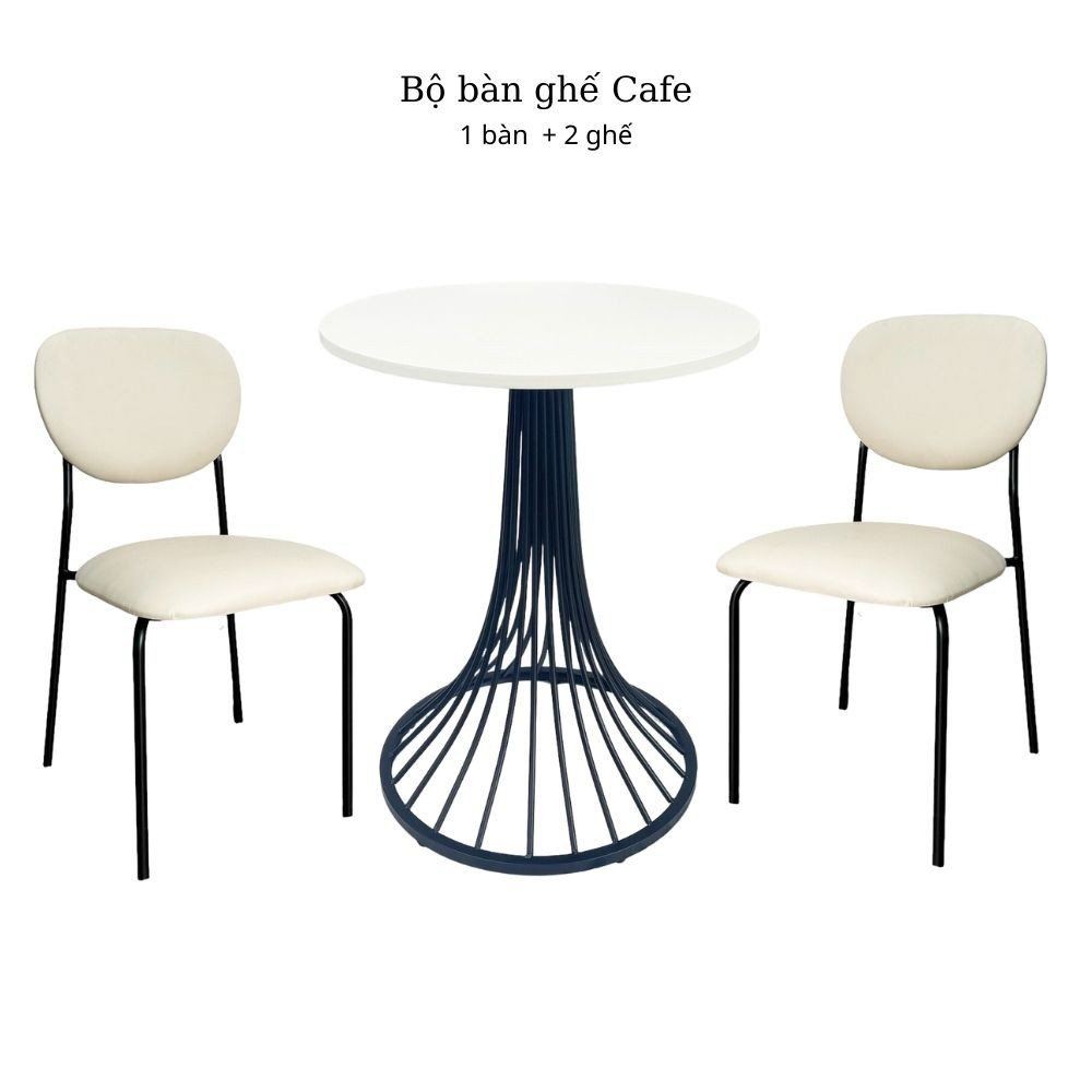 Bộ bàn cafe tròn chân sắt và 2 ghế nệm simili CBCFB212 kết hợp giữa bàn cafe tròn chân sắt loa kèn mặt gỗ và 2 ghế nệm chân sắt, màu sắc hài hoà phù hợp với nhiều không gian sử dụng. Bên cạnh đó khhác hàng có thể thay đổi màu sắc theo yêu cầu sao cho phù hợp với không gian.