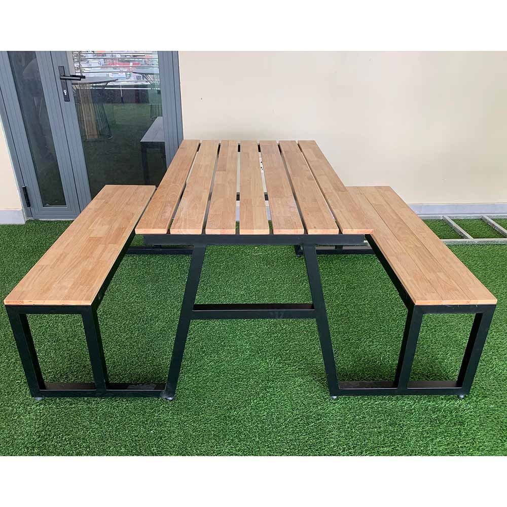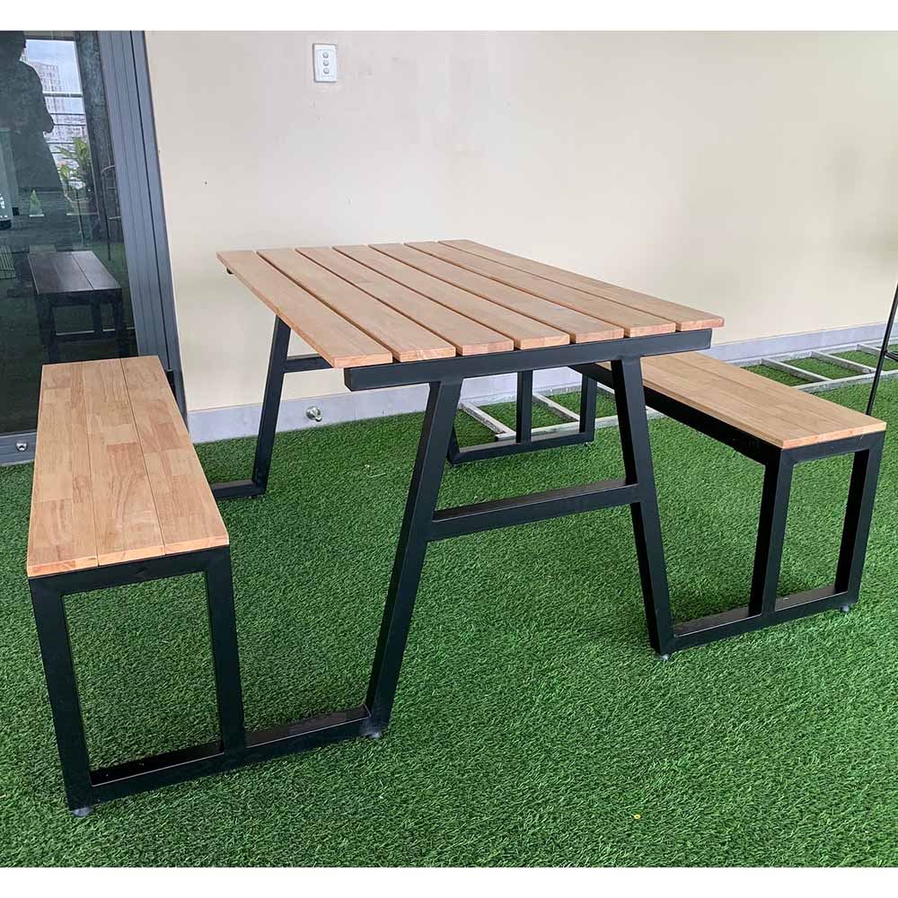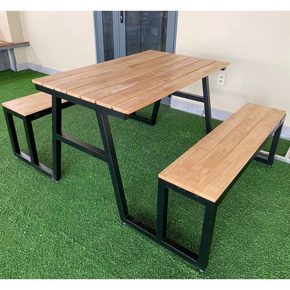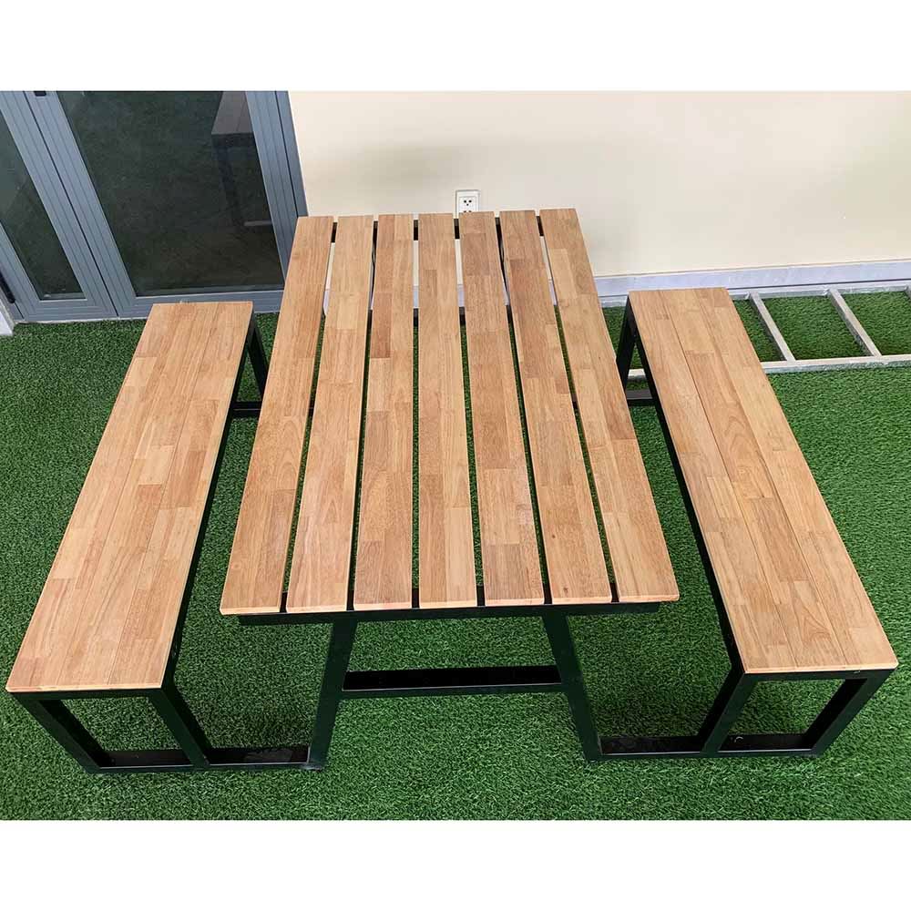Combo bộ bàn ghế gỗ cao su khung sắt lắp ráp CBBA028 gồm 1 bàn ăn và 2 ghế băng dài gắn liền với nhau. Vật liệu chính để tạo nên bộ bàn ăn CBBA028 là gỗ cao su kết hợp cùng khung sắt đem đến sản phẩm vừa mang nét mộc mạc lại vừa hiện đại. Mặt gỗ được hoàn thiện từ gỗ cao su tự nhiên với đặc điểm nổi bật là độ bền cao, mặt gỗ được xử lý PU chống thấm nước, cong vênh giúp bạn yên tâm vệ sinh bàn mà không sợ bong tróc. Chân bàn được thiết kế hơi chếch ra một góc để có thể tăng thêm khả năng chịu lực của sản phẩm đồng thời tạo sự vững chãi, an toàn khi sử dụng.