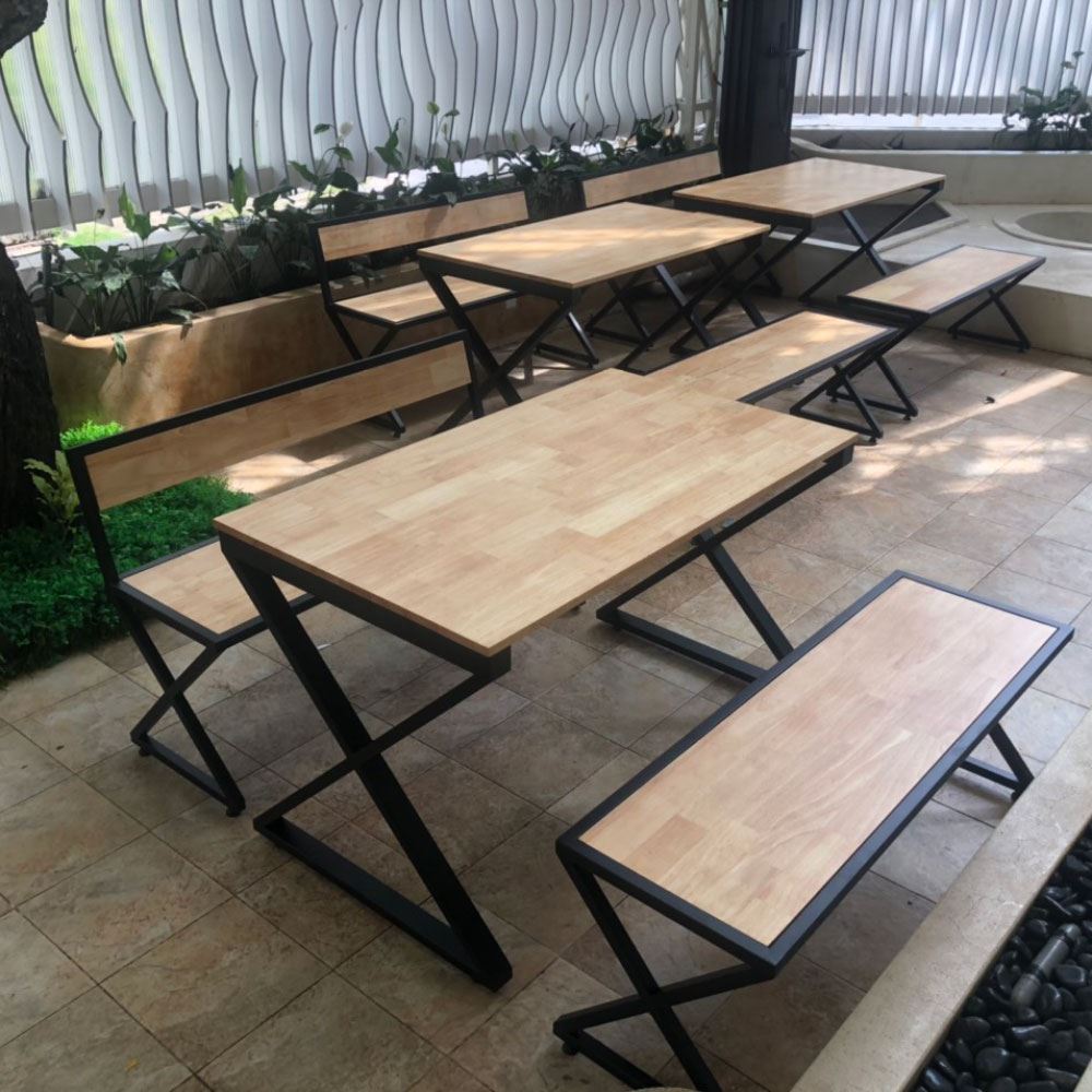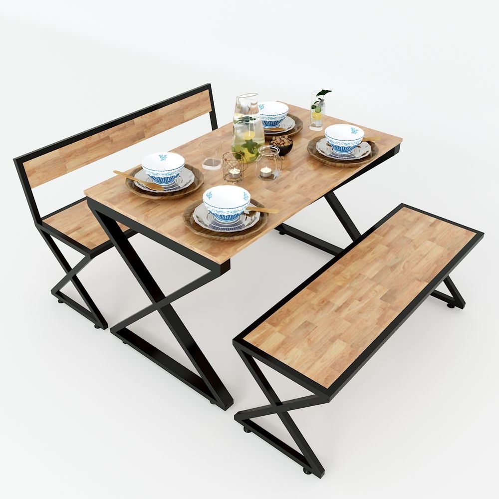 Chất liệu mặt bàn gỗ cao su tiêu chuẩn AA sơn Pu hoàn thiện màu sắc tự nhiên cực đẹp và bền, không sợ nước và dễ dàng lau chùi cùng với hệ chân chữ X, chân bàn lắp ráp ngàm chân ghế chữ X cố định sơn tĩnh điện đen chất lượng cao.