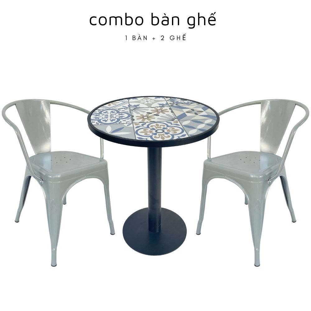 Bộ bàn ghế cafe gạch men hoa văn và 2 ghế tolix