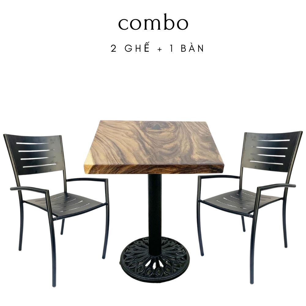 Bộ bàn ghế cafe gỗ me tây tự nhiên và 2 ghế sắt