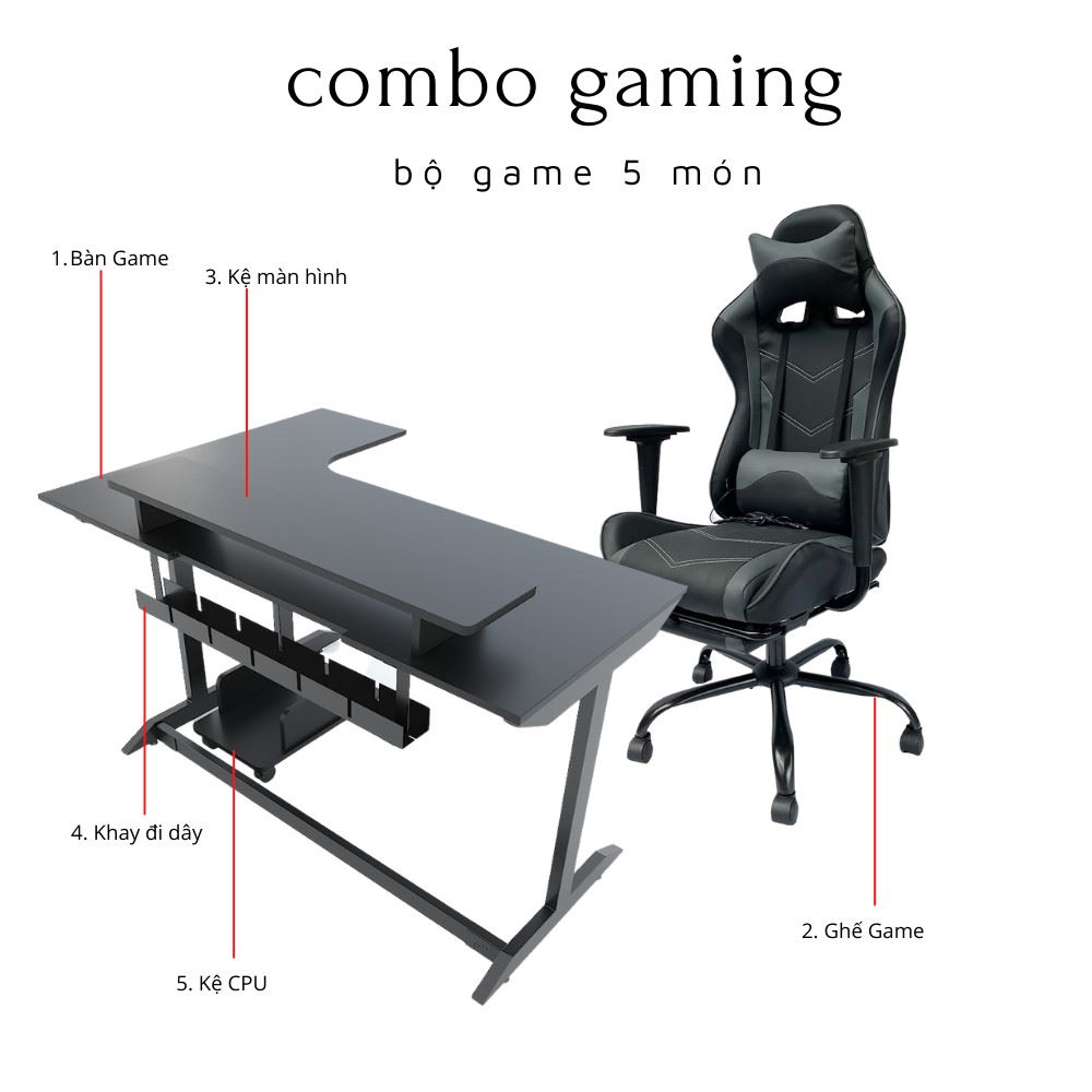 Bộ Bàn Ghế Gaming Đen Xám Kèm Phụ Kiện CBG68015 bao gồm các món đồ từ cơ bản như Bàn Ghế Gaming đến các phụ kiện kèm theo ( Kệ màn hình, Khay đi dây diện, Kệ để CPU) mang đến sự tiện ích và thoải mái cho người sử dụng. Bên cạnh đó, các combo sản phẩm cũng giúp bạn tiết kiệm hơn rất nhiều khi mua lẻ từng sản phẩm.