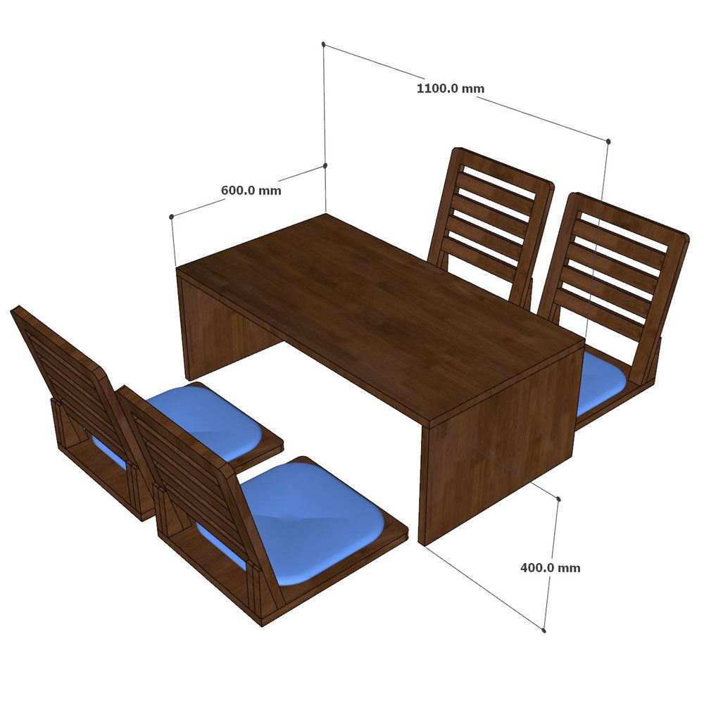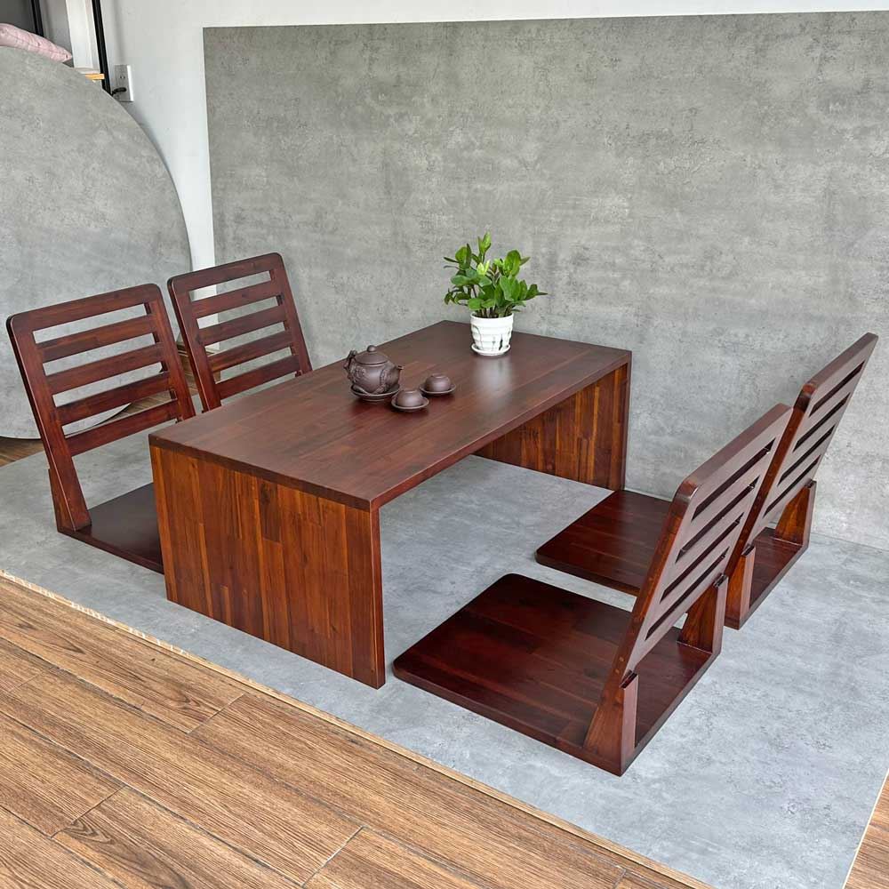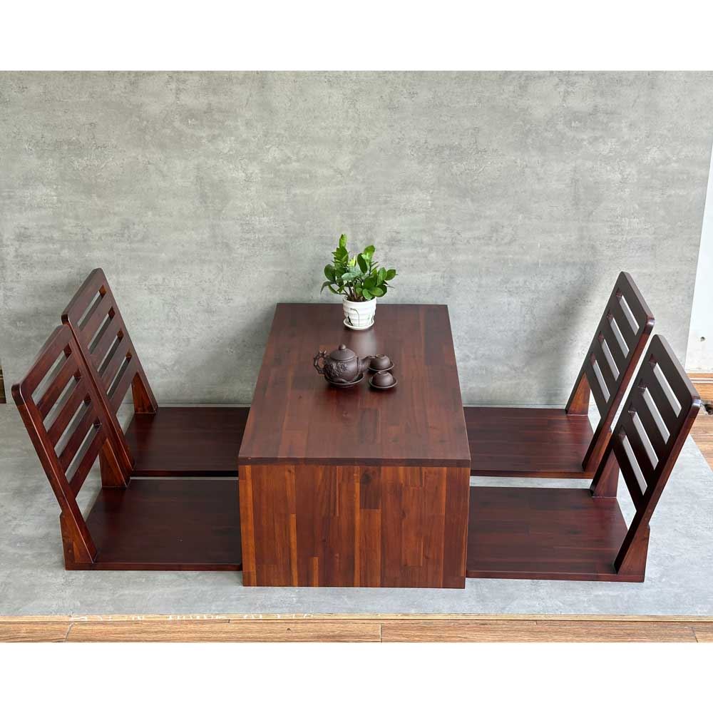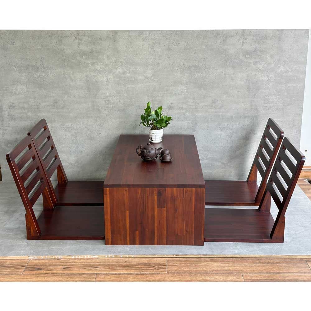 Bộ bàn ghế ngồi bệt CBCF259 bao gồm 1 bàn gỗ chữ nhật có kích thước 110x60cm và 4 ghế ngồi bệt. Với phong cách tối giản, hướng tới tính bền vững, bộ bàn ghế ngồi bệt chỉ mang những hình khối và đường nét đơn giản, một sự trơn phẳng trong thiết kế, không hoa mỹ và cầu kỳ. Bộ bàn ghế ngồi bệt kiểu Nhật này sẽ là sự lựa chọn tuyệt vời dành cho các không gian mang phong cách tối giản. Với chất gỗ tự nhiên, nó sẽ tạo ra cảm giác nhẹ nhàng và gần gũi cho căn phòng. Ngoài ra, bộ bàn ghế này cũng là sự lựa chọn phù hợp dành cho các không gian quán trà sữa, quán cafe hoặc quán ăn nhà hàng mang phong cách tương tự.