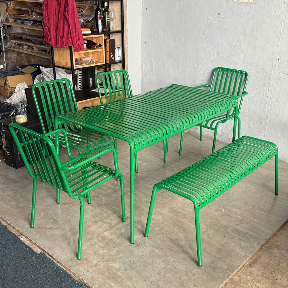 Bộ bàn ghế sắt ngoài trời sơn tĩnh điện nhiều màu - CBNT002 gồm có 1 bàn dài 140cm kết hợp với các mẫu ghế có tay, không tay và một ghế băng dài 120cm, ghế có thể luồn vào bên dưới bàn rất gọn gàng. Bộ sưu tập màu sơn tĩnh điện đa dạng với hơn 50 màu sắc lựa chọn. Quý khách hàng hãy liên hệ với nhân viên tư vấn đề chọn màu sơn