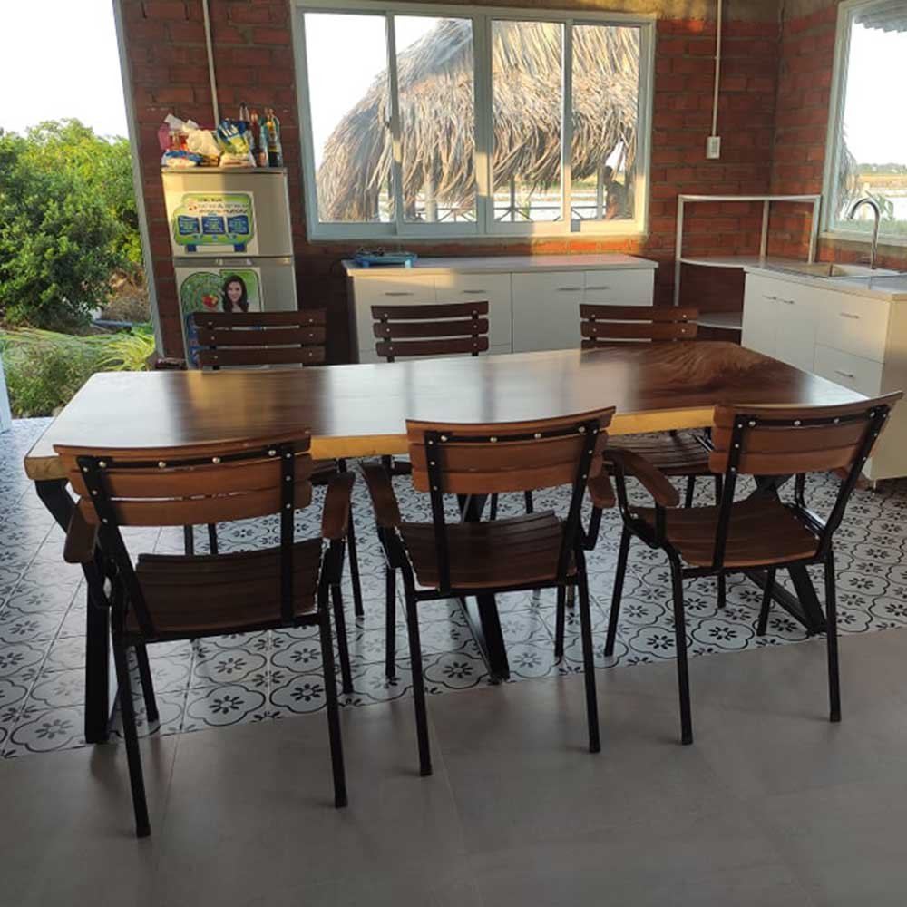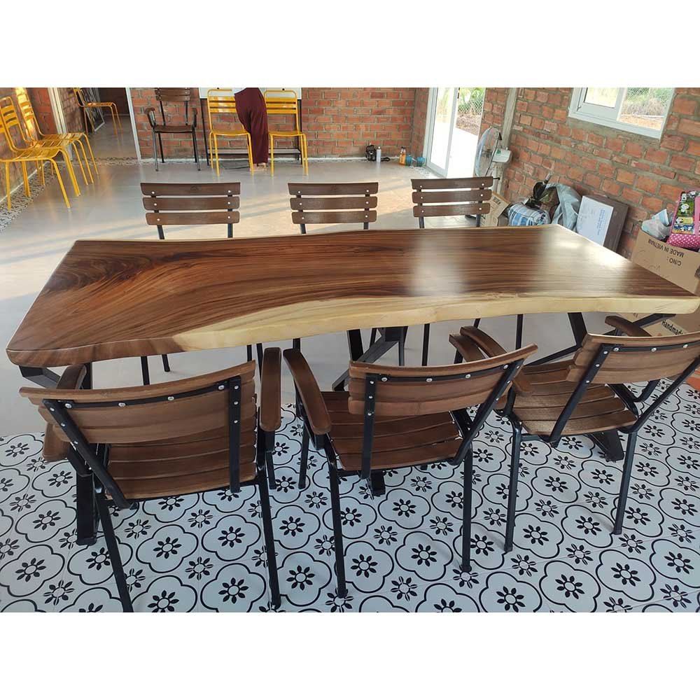 Bộ bàn ghế ăn mặt bàn gỗ me tây nguyên tấm vân màu gỗ tự nhiên đẹp mắt