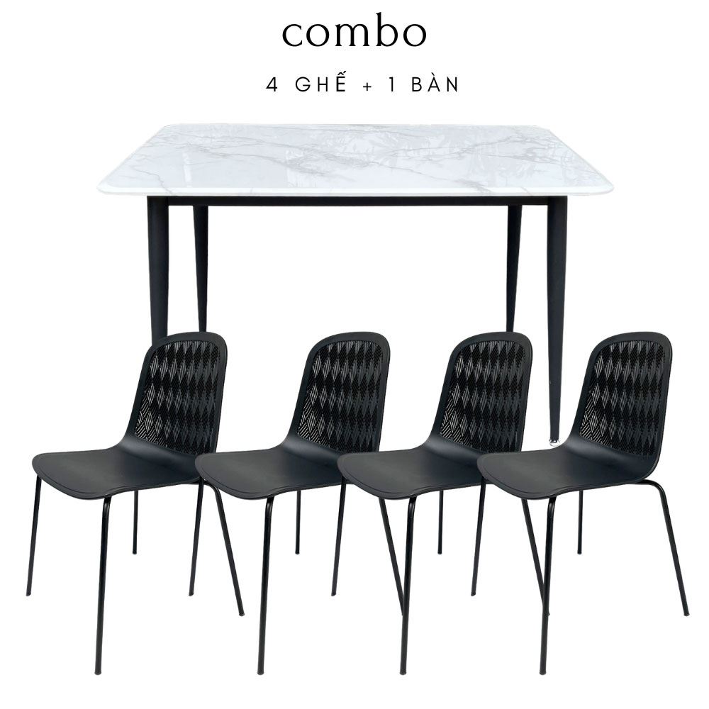Bộ bàn ăn 120cm và 4 ghế CBBA068 là bộ sản phẩm kích thước nhỏ phù hợp với các không gian căn hộ nhỏ hay có thể dùng trong các nhà hàng, quán ăn với sự kết hợp của Bàn ăn 120cm chân sắt mặt đá vân mây BA68092 và 4 Ghế cafe lưng nhựa chân sắt sơn đen ST3003A rất vừa vặn và đẹp mắt. Nếu quý khách đang tìm kiếm bộ bàn ghế ăn dành cho 4 người thì đây sẽ là một sự lựa chọn rất đáng xem sét.
