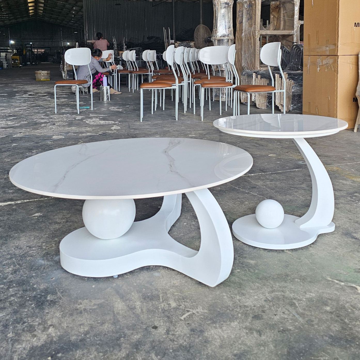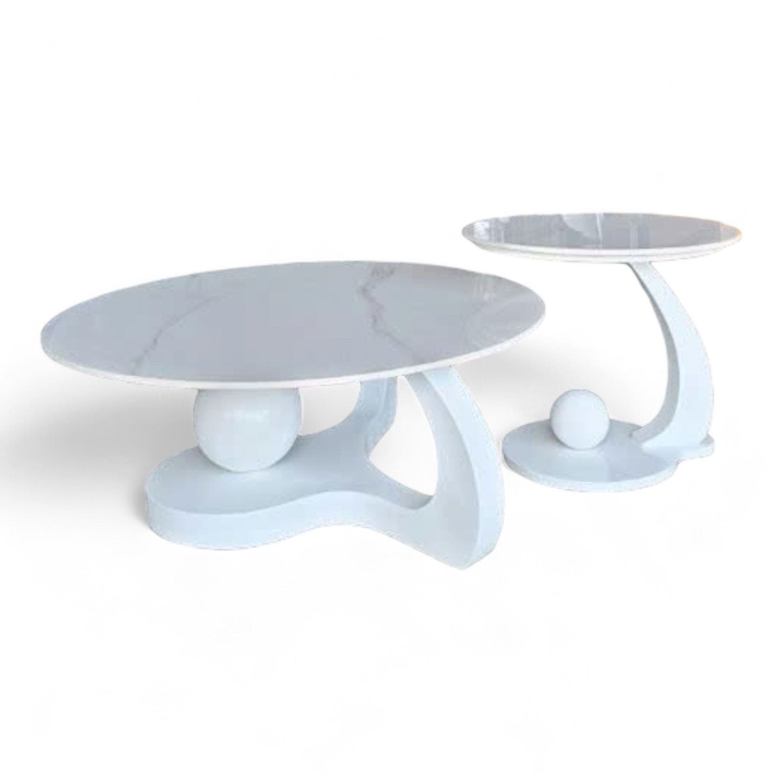 Bộ bàn sofa đôi mặt đá chân sắt TT68307 thiết kế hiện đại với hai quả bóng tròn làm điểm nhấn, mặt đá Ceramic dày 12mm siêu bóng chống thấm nước, đá vân mây với màu trắng hoặc đen, chân sắt tạo hình sơn tĩnh điện với 3 màu lựa chọn.